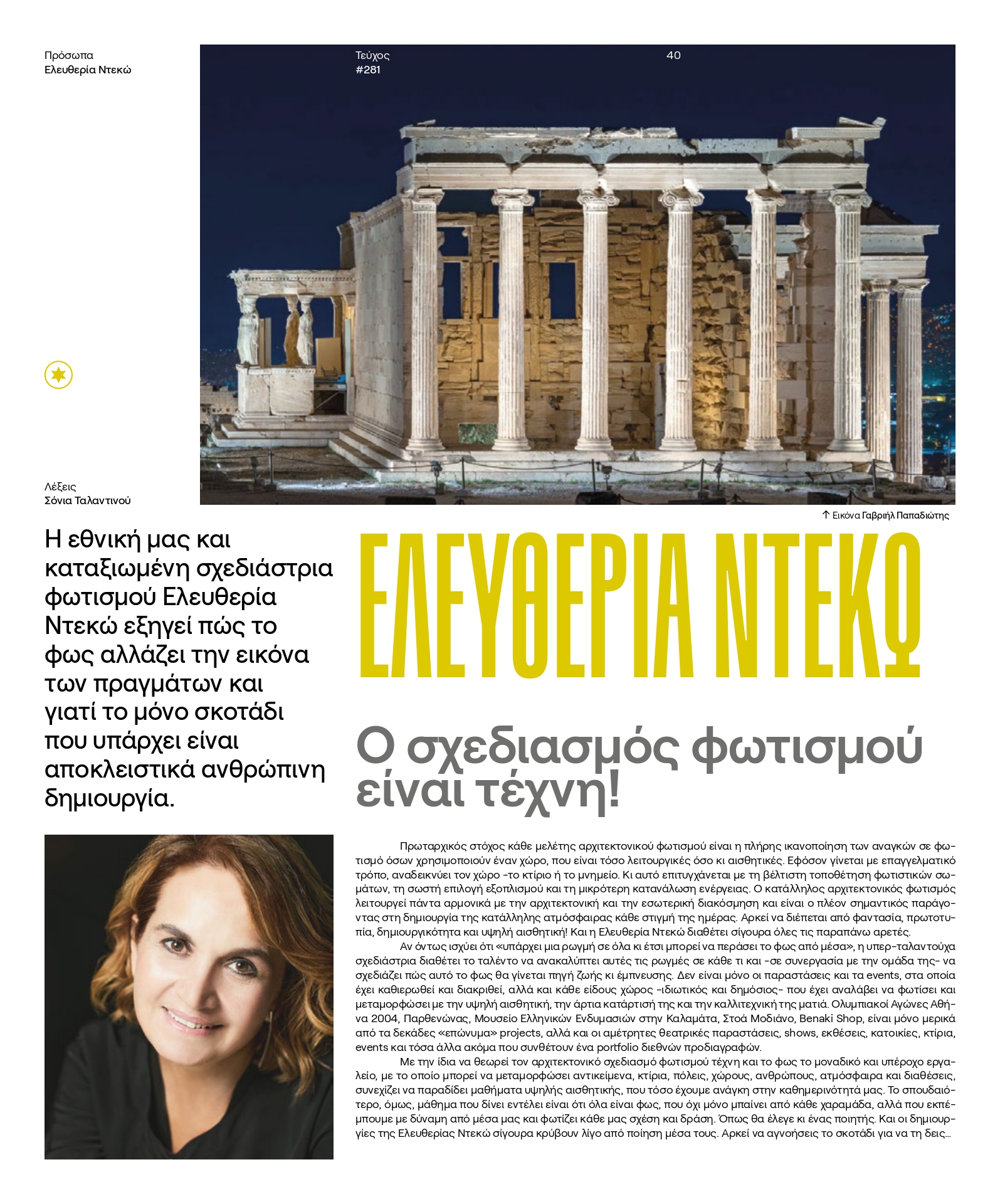 Η εθνική μας και καταξιωμένη σχεδιάστρια φωτισμού Ελευθερία Ντεκώ εξηγεί πώς το φως αλλάζει την εικόνα των πραγμάτων και γιατί το μόνο σκοτάδι που υπάρχει είναι αποκλειστικά ανθρώπινη δημιουργία.
