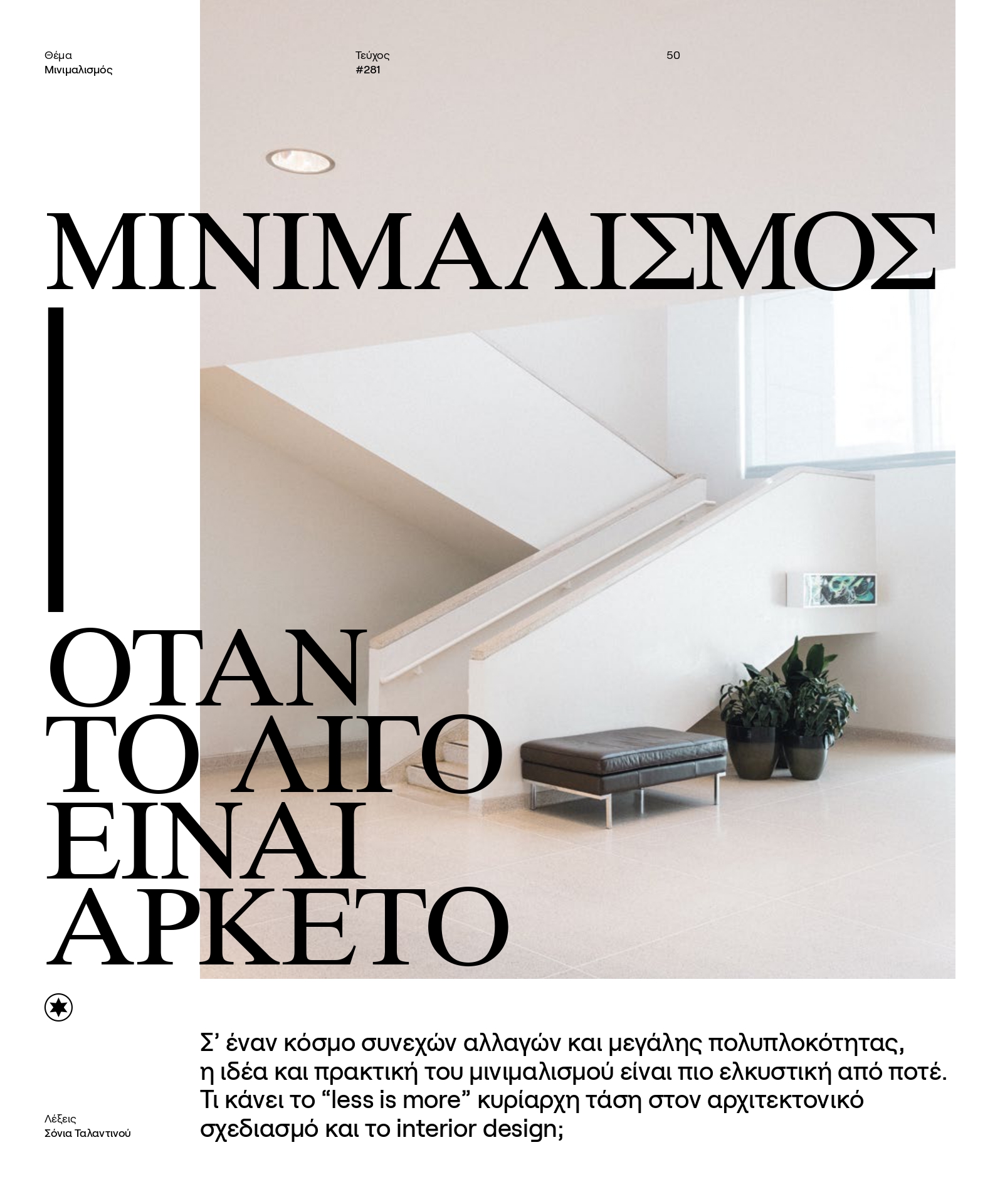 Σ’ έναν κόσμο συνεχών αλλαγών και μεγάλης πολυπλοκότητας, η ιδέα και πρακτική του μινιμαλισμού είναι πιο ελκυστική από ποτέ. Τι κάνει το “less is more” κυρίαρχη τάση στον αρχιτεκτονικό σχεδιασμό και το interior design;