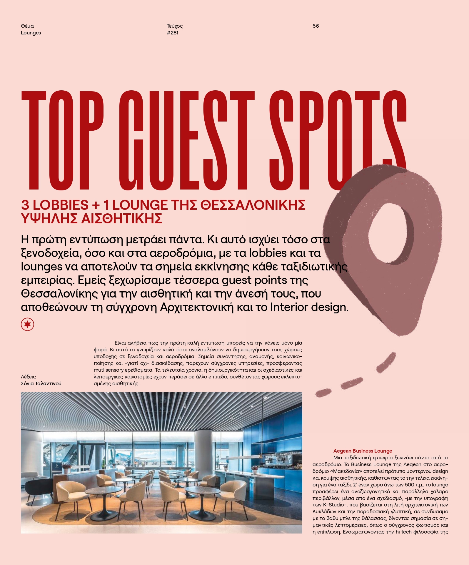 Η πρώτη εντύπωση μετράει πάντα. Κι αυτό ισχύει τόσο στα ξενοδοχεία, όσο και στα αεροδρόμια, με τα lobbies και τα lounges να αποτελούν τα σημεία εκκίνησης κάθε ταξιδιωτικής εμπειρίας. Εμείς ξεχωρίσαμε τέσσερα guest points της Θεσσαλονίκης για την αισθητική και την άνεσή τους, που αποθεώνουν τη σύγχρονη Αρχιτεκτονική και το Interior design.