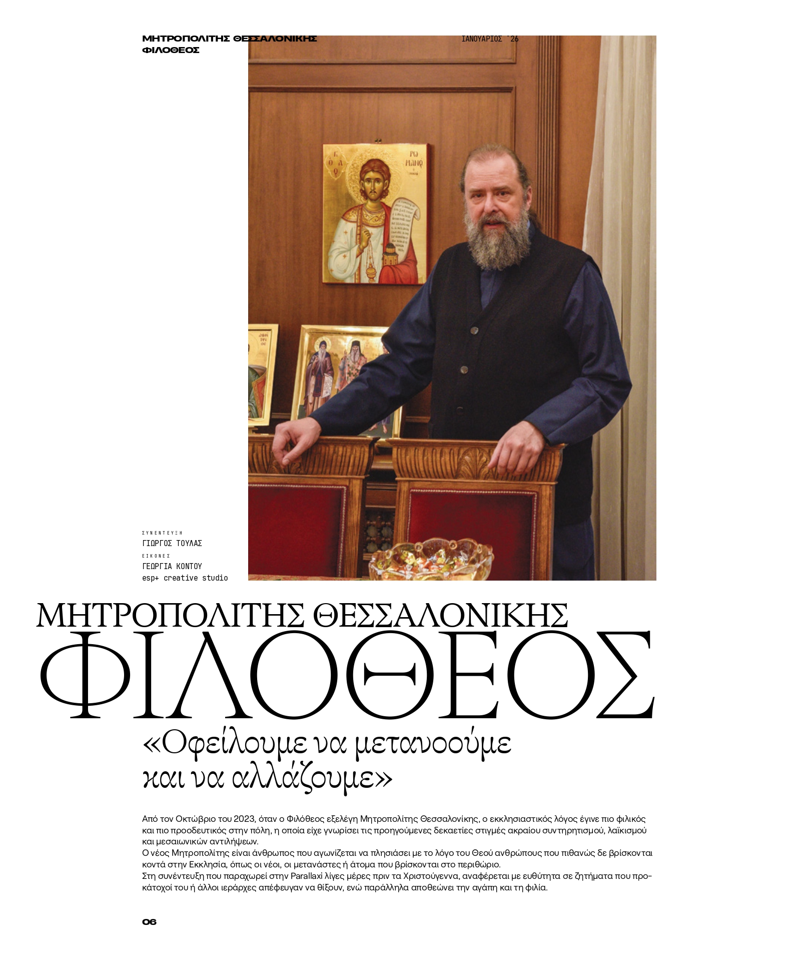 Στη συνέντευξη που παραχωρεί στην Parallaxi λίγες μέρες πριν τα Χριστούγεννα, αναφέρεται με ευθύτητα σε ζητήματα που προκάτοχοί του ή άλλοι ιεράρχες απέφευγαν να θίξουν, ενώ παράλληλα αποθεώνει την αγάπη και τη φιλία.