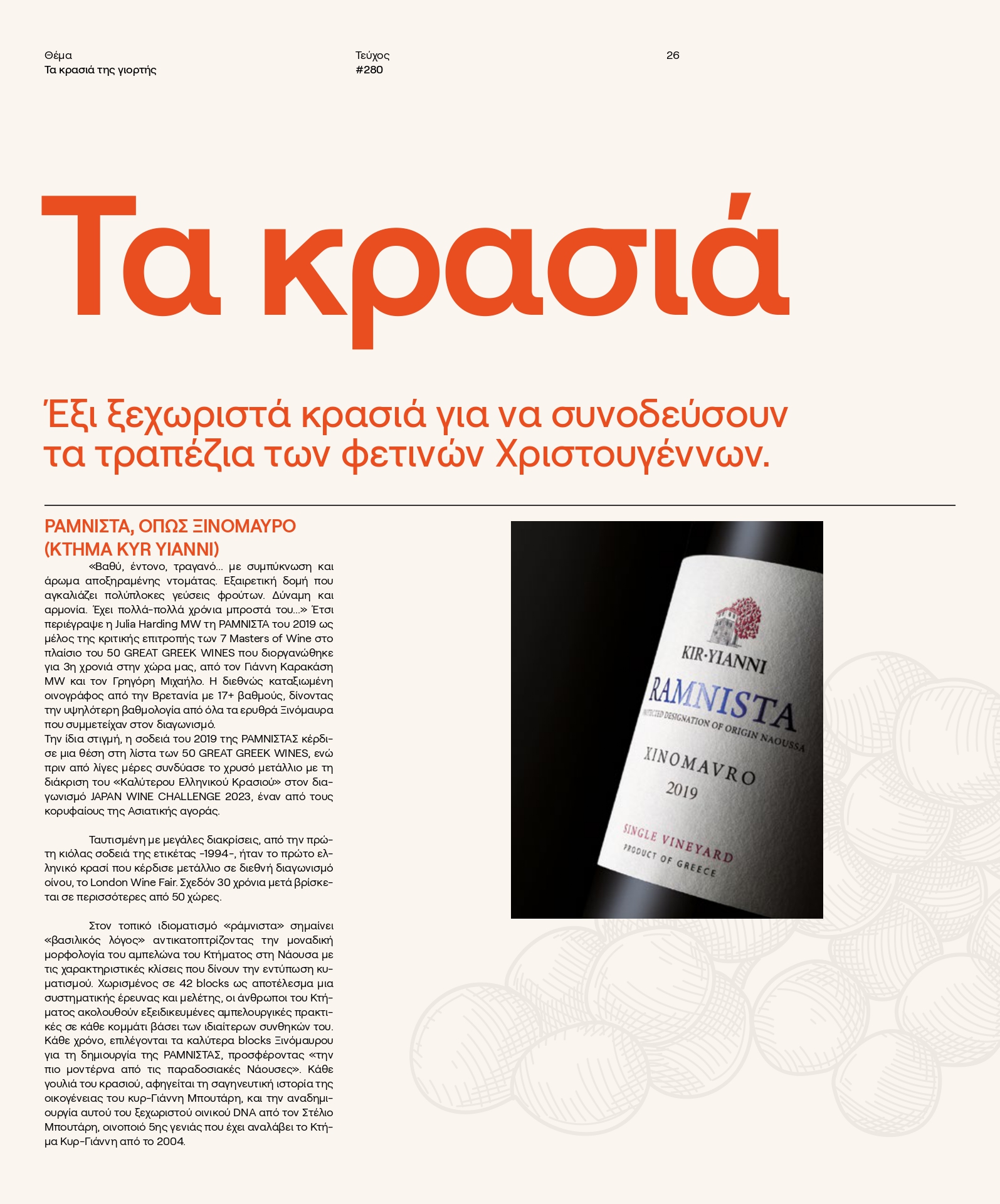 Για τους παραγωγούς αποτελεί μια απαιτητική διαδικασία. Για τους μύστες, στοιχείο πολιτισμού. Για όσους ξέρουν να χαίρονται τη ζωή, μια δυνατή απόλαυση. Για όλους τους υπόλοιπους, η καλύτερη συντροφιά, το ιδανικό συνοδευτικό του φαγητού, μια θεία επινόηση, ποίηση, φιλοσοφία, συναντήσεις, γέλια, συγκινήσεις. Μια πυροδότηση συναισθημάτων που οδηγεί σώμα και πνεύμα σε μέθεξη. Το να κάνεις καλό κρασί είναι μια δεξιότητα, αλλά το να παράγεις φίνο κρασί είναι αληθινή τέχνη.