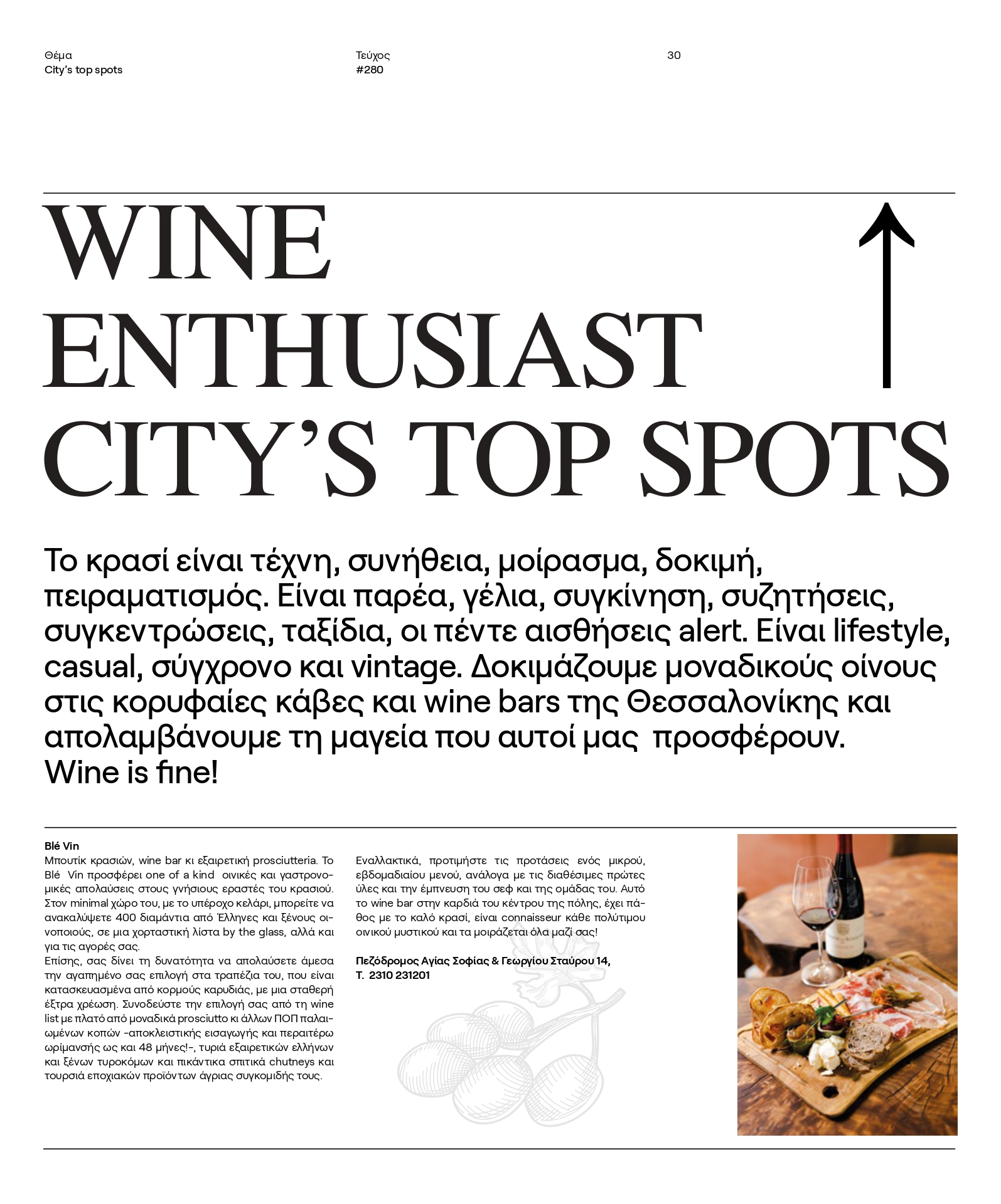 Το κρασί είναι τέχνη, συνήθεια, μοίρασμα, δοκιμή, πειραματισμός. Είναι παρέα, γέλια, συγκίνηση, συζητήσεις, συγκεντρώσεις, ταξίδια, οι πέντε αισθήσεις alert. Είναι lifestyle, casual, σύγχρονο και vintage. Δοκιμάζουμε μοναδικούς οίνους στις κορυφαίες κάβες και wine bars της Θεσσαλονίκης και απολαμβάνουμε τη μαγεία που αυτοί μας προσφέρουν. Wine is fine!