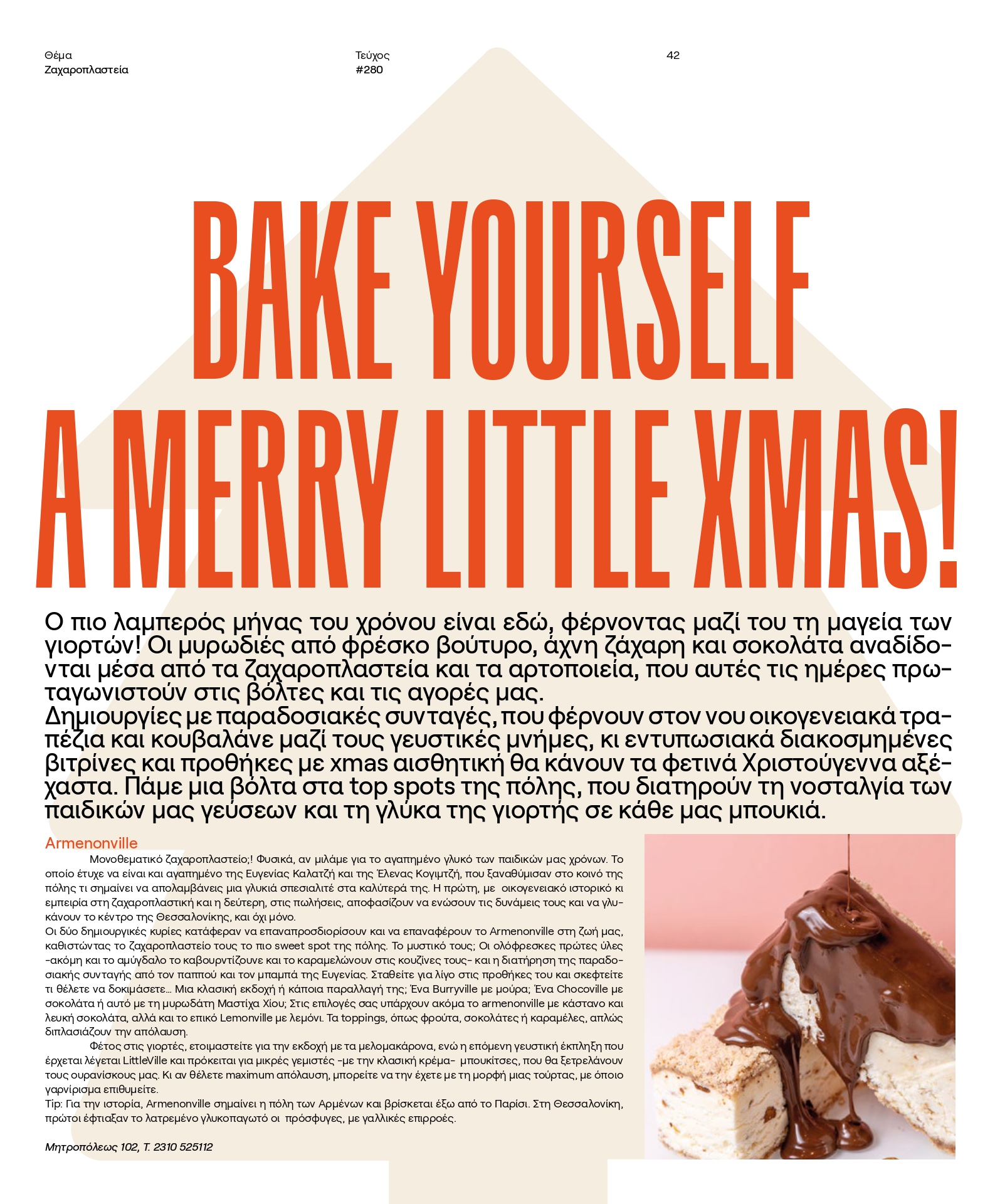Ο πιο λαμπερός μήνας του χρόνου είναι εδώ, φέρνοντας μαζί του τη μαγεία των γιορτών! Οι μυρωδιές από φρέσκο βούτυρο, άχνη ζάχαρη και σοκολάτα αναδίδονται μέσα από τα ζαχαροπλαστεία και τα αρτοποιεία, που αυτές τις ημέρες πρωταγωνιστούν στις βόλτες και τις αγορές μας. Δημιουργίες με παραδοσιακές συνταγές, που φέρνουν στον νου οικογενειακά τραπέζια και κουβαλάνε μαζί τους γευστικές μνήμες, κι εντυπωσιακά διακοσμημένες βιτρίνες και προθήκες με xmas αισθητική θα κάνουν τα φετινά Χριστούγεννα αξέχαστα. Πάμε μια βόλτα στα top spots της πόλης, που διατηρούν τη νοσταλγία των παιδικών μας γεύσεων και τη γλύκα της γιορτής σε κάθε μας μπουκιά.