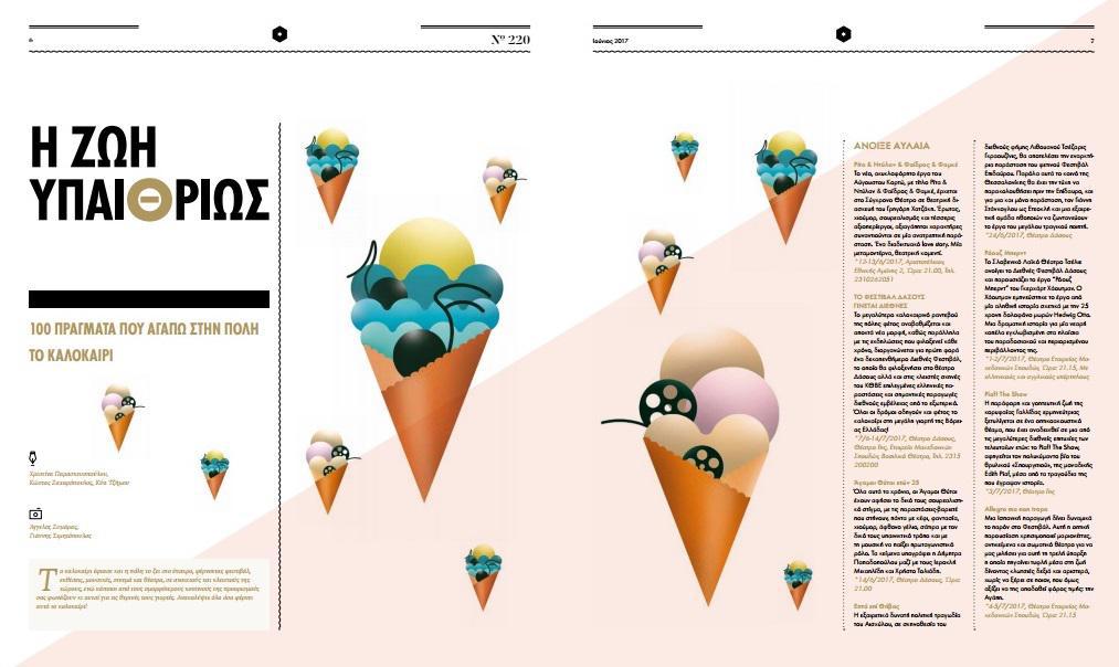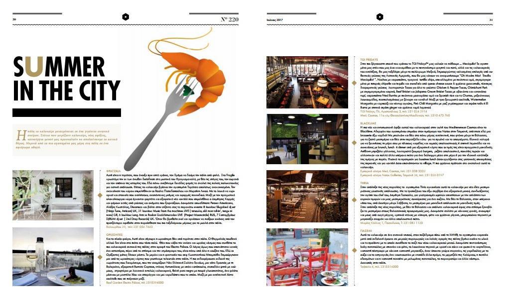 Το τεύχος καλοκαιριού είναι ο απόλυτος οδηγός για το αστικό καλοκαίρι. Καλοκαίρι μπορεί να σημαίνει ήλιος και θάλασσα, αλλά σημαίνει και συναυλίες, θερινά σινεμά και θέατρα, σημαίνει φεστιβάλ, σημαίνει σχολικές διακοπές και μπόλικο οργανωμένο fun για παιδιά, σημαίνει βόλτες, εκδηλώσεις, πράγματα υπαιθρίως κομμένα και ραμμένα για κάθε γούστο και καπρίτσιο και φυσικά τα πιο καλοκαιρινά στέκια της πόλης.