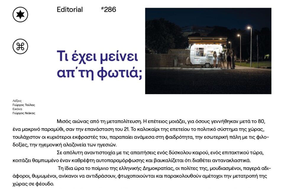 Μισός αιώνας από τη μεταπολίτευση. Η επέτειος μοιάζει, για όσους γεννήθηκαν μετά το 80, ένα μακρινό παραμύθι, σαν την επανάσταση του 21. Το καλοκαίρι της επετείου το πολιτικό σύστημα της χώρας, τουλάχιστον οι κυριότεροι εκφραστές του, παραπαίει ανάμεσα στη φαιδρότητα, την εσωτερική πάλη με τις φιλοδοξίες, την ηγεμονική αλαζονεία των ηγεσιών.