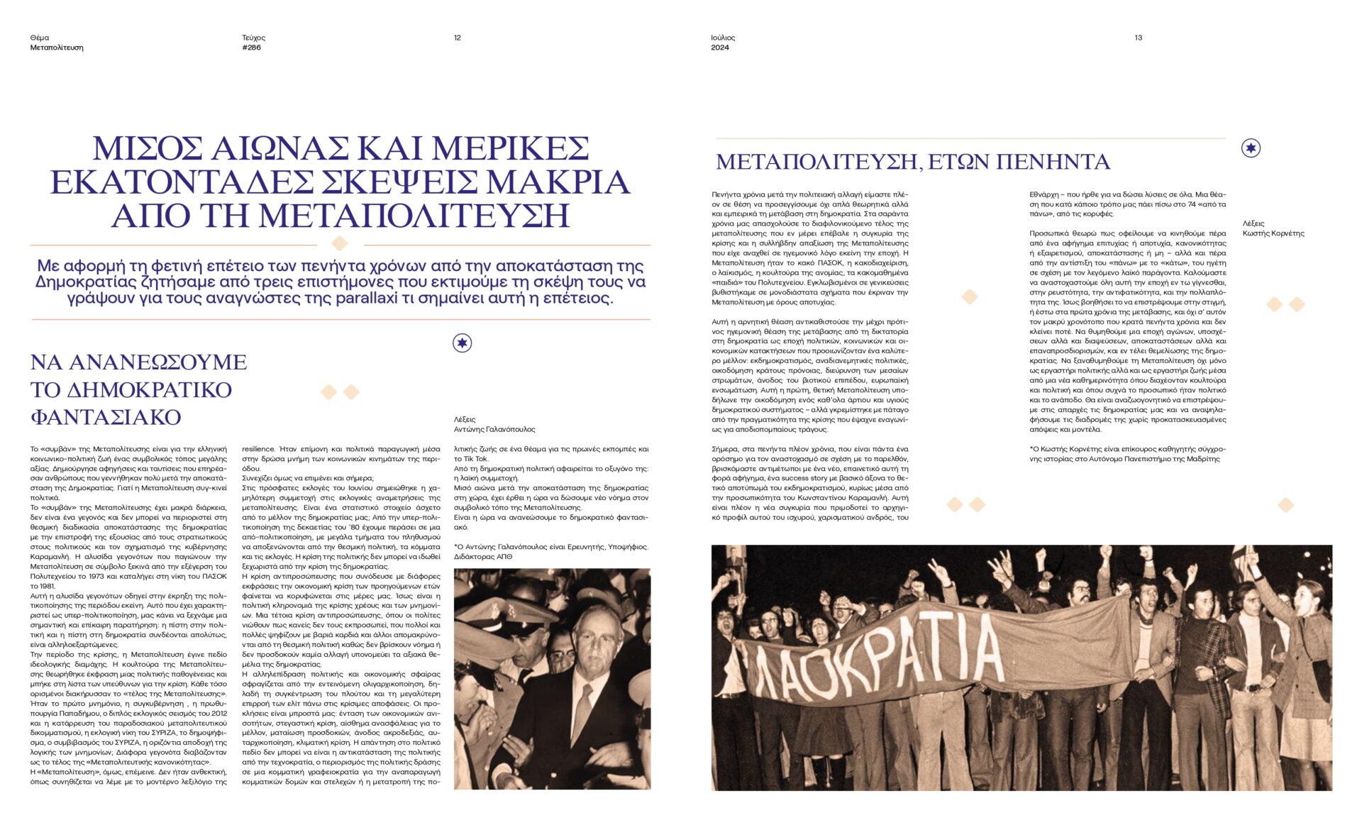 Με αφορμή τη φετινή επέτειο των πενήντα χρόνων από την αποκατάσταση της Δημοκρατίας ζητήσαμε από τρεις επιστήμονες που εκτιμούμε τη σκέψη τους να γράψουν για τους αναγνώστες της parallaxi τι σημαίνει αυτή η επέτειος.