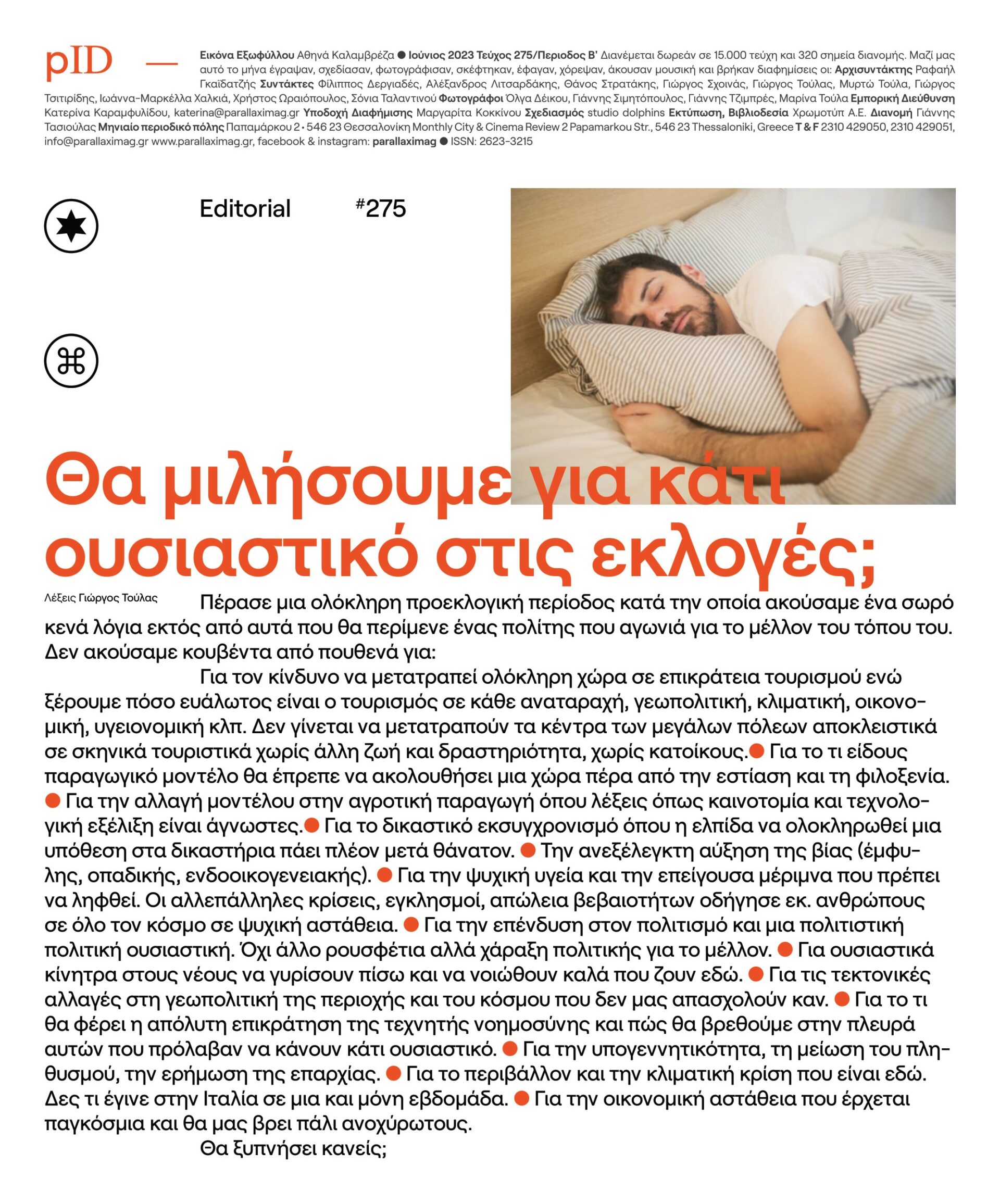 Η parallaxi Ιουνίου κυκλοφορεί παντού στην πόλη με ένα τεύχος γεμάτο καλοκαίρι! Όσα θα συμβούν στην πόλη, αλλά και τα πέριξ της και δεν πρέπει να χάσεις, τα εστιατόρια και μπαρ που σε περιμένουν στις ζεστές βραδιές που έρχονται, αλλά και φυσικά με θέματα που θα σας κρατήσουν αμείωτο το ενδιαφέρον μέχρι την τελευταία σελίδα. Από το σεισμό του 1978 στη Θεσσαλονίκη και τα Άνω Λαδάδικα του σήμερα μέχρι την σπουδαία Ιωάννα Μανωλεδάκη και την ιστορία του Βασιλικού Θεάτρου.