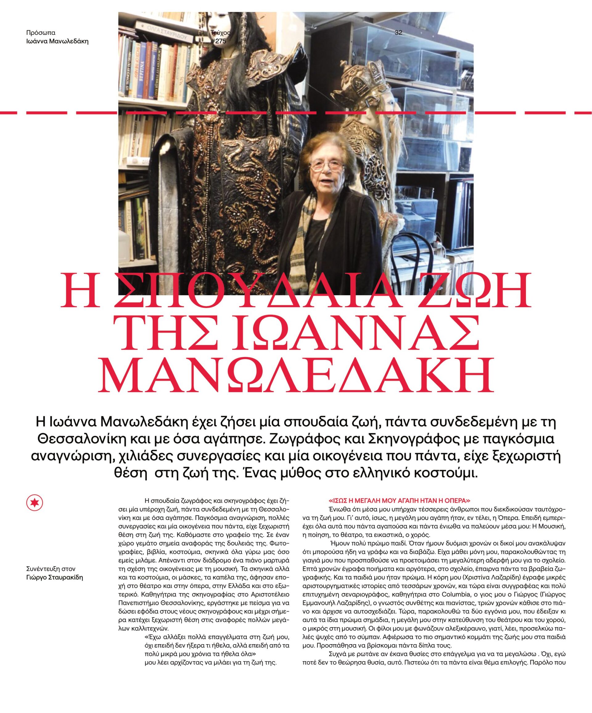 Η Ιωάννα Μανωλεδάκη έχει ζήσει μία σπουδαία ζωή, πάντα συνδεδεμένη με τη Θεσσαλονίκη και με όσα αγάπησε. Ζωγράφος και Σκηνογράφος με παγκόσμια αναγνώριση, χιλιάδες συνεργασίες και μία οικογένεια που πάντα, είχε ξεχωριστή θέση στη ζωή της. Ένας μύθος στο ελληνικό κοστούμι.