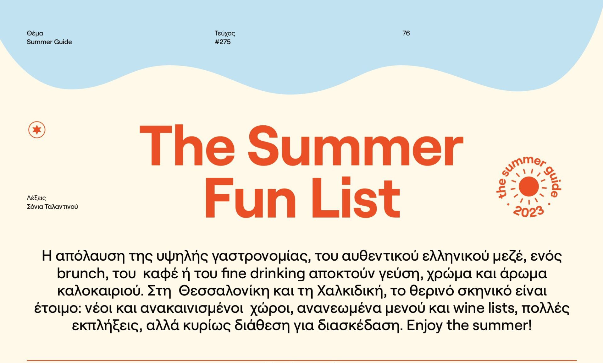 Η απόλαυση της υψηλής γαστρονομίας, του αυθεντικού ελληνικού μεζέ, ενός brunch, του καφέ ή του fine drinking αποκτούν γεύση, χρώμα και άρωμα καλοκαιριού. Στη Θεσσαλονίκη και τη Χαλκιδική, το θερινό σκηνικό είναι έτοιμο: νέοι και ανακαινισμένοι χώροι, ανανεωμένα μενού και wine lists, πολλές εκπλήξεις, αλλά κυρίως διάθεση για διασκέδαση. Enjoy the summer!