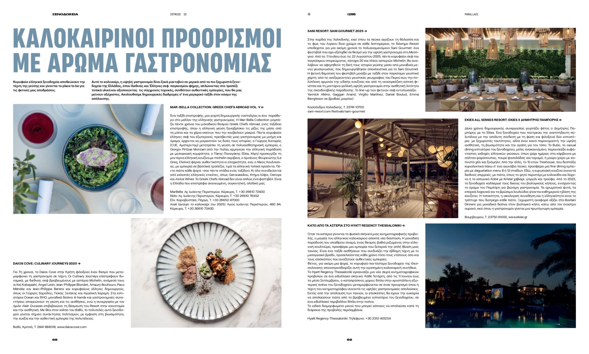Αυτό το καλοκαίρι, η υψηλή γαστρονομία δίνει ξανά ραντεβού σε μερικά από τα πιο ξεχωριστά ξενοδοχεία της Ελλάδας, όπου διεθνείς και Έλληνες σεφ παγκοσμίου φήμης, απλώνοντας στο τραπέζι τοπικά υλικά και αξιοποιώντας τις σύγχρονες τεχνικές, συνθέτουν αυθεντικές εμπειρίες, που θα μας μείνουν αξέχαστες.