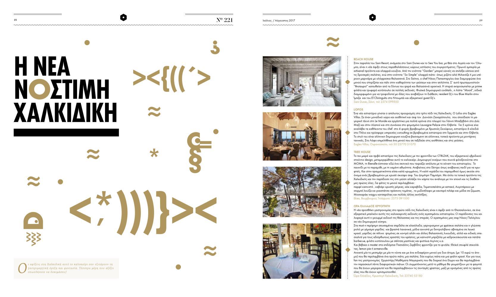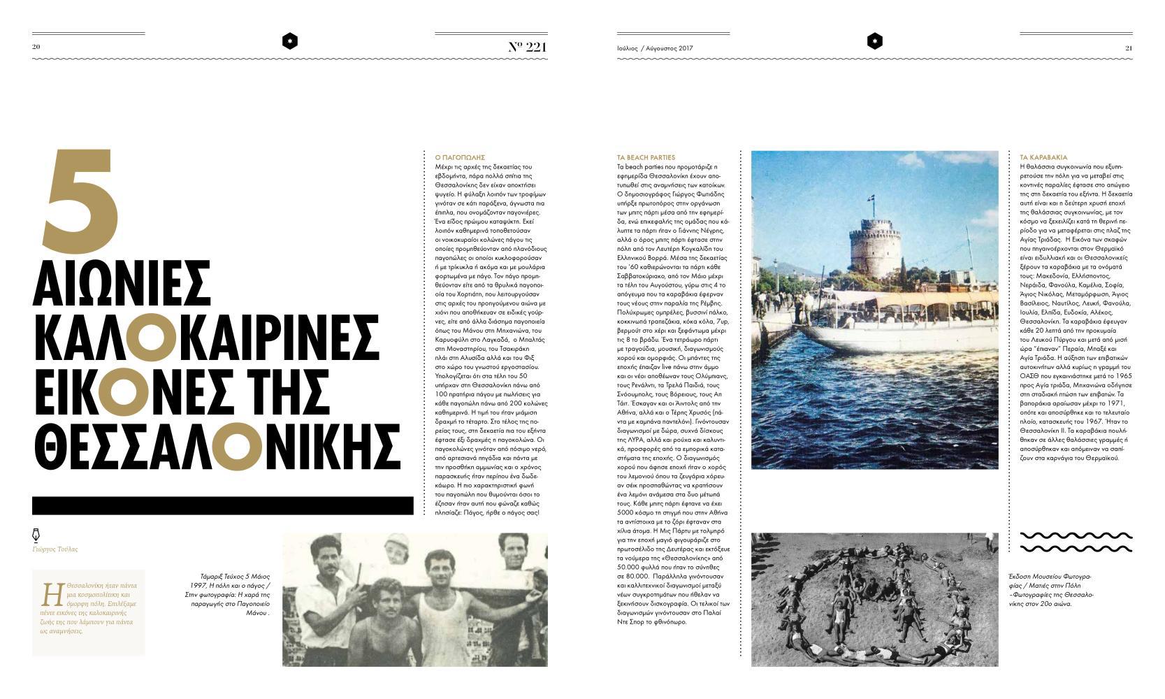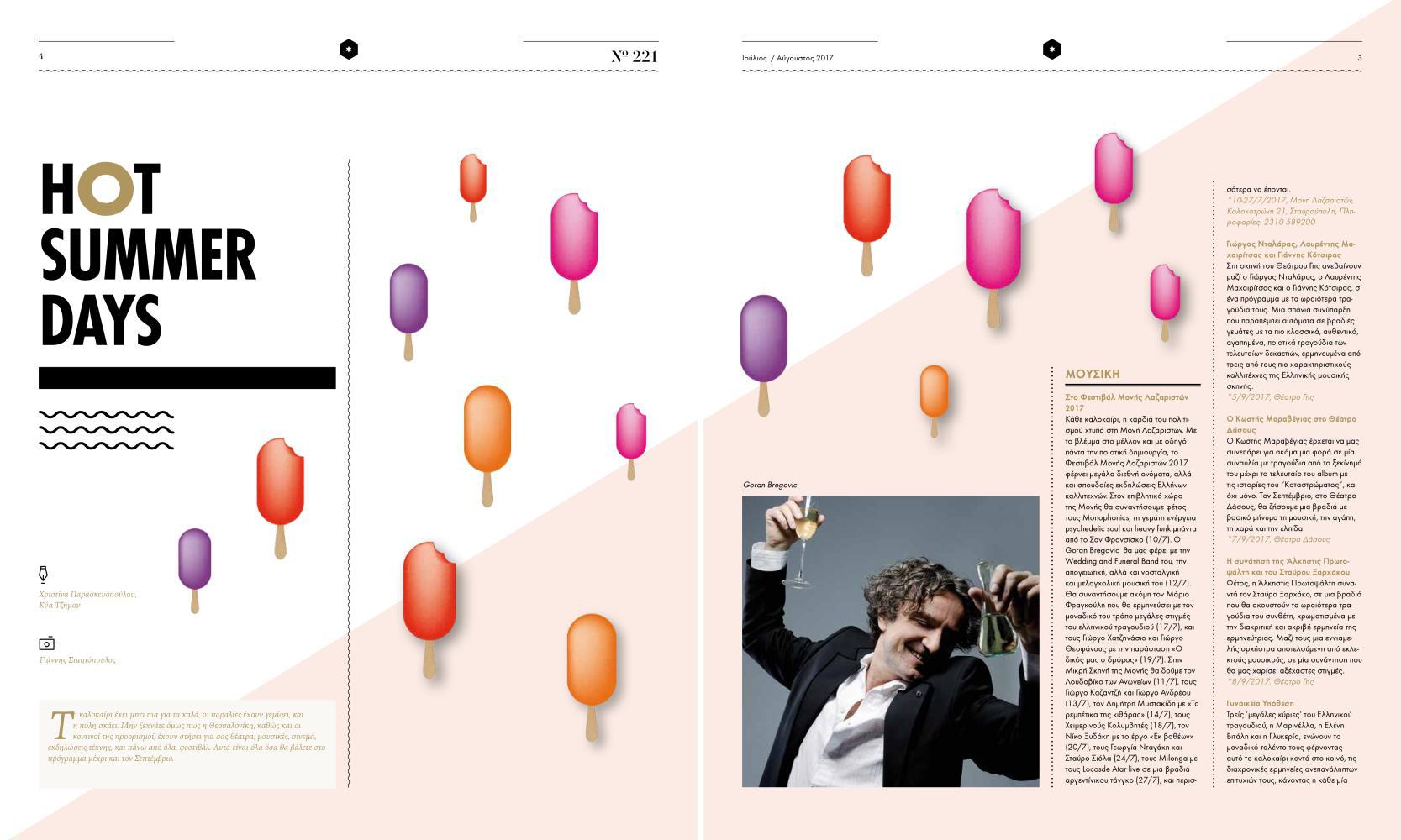 Το τεύχος καλοκαιριού είναι ο απόλυτος οδηγός για το αστικό καλοκαίρι, για τα φεστιβάλ που απλώνονται σε όλη τη Β. Ελλάδα και γίνονται προορισμός και για την κοντινή Χαλκιδική που δεν παύει να σε εκπλήσσει. Ακόμη θυμίζουμε καλοκαιρινές εικόνες από την Παλιά Θεσσαλονίκη.