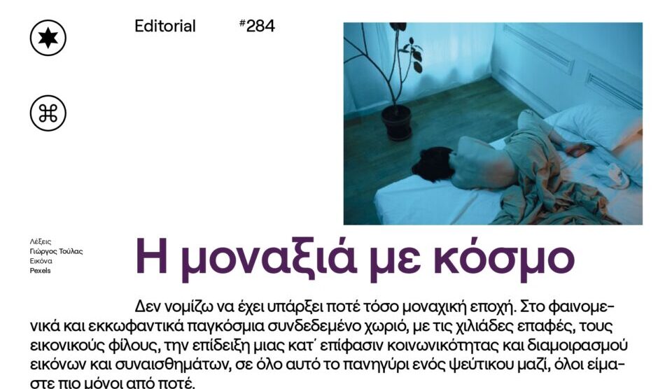 Ο Γιώργος Τούλας γράφει για τη μοναχική εποχή που ζούμε. Μια μοναξιά όμως αλλιώτικη, που δεν είχε ποτέ της γύρω τόσο κόσμο…
