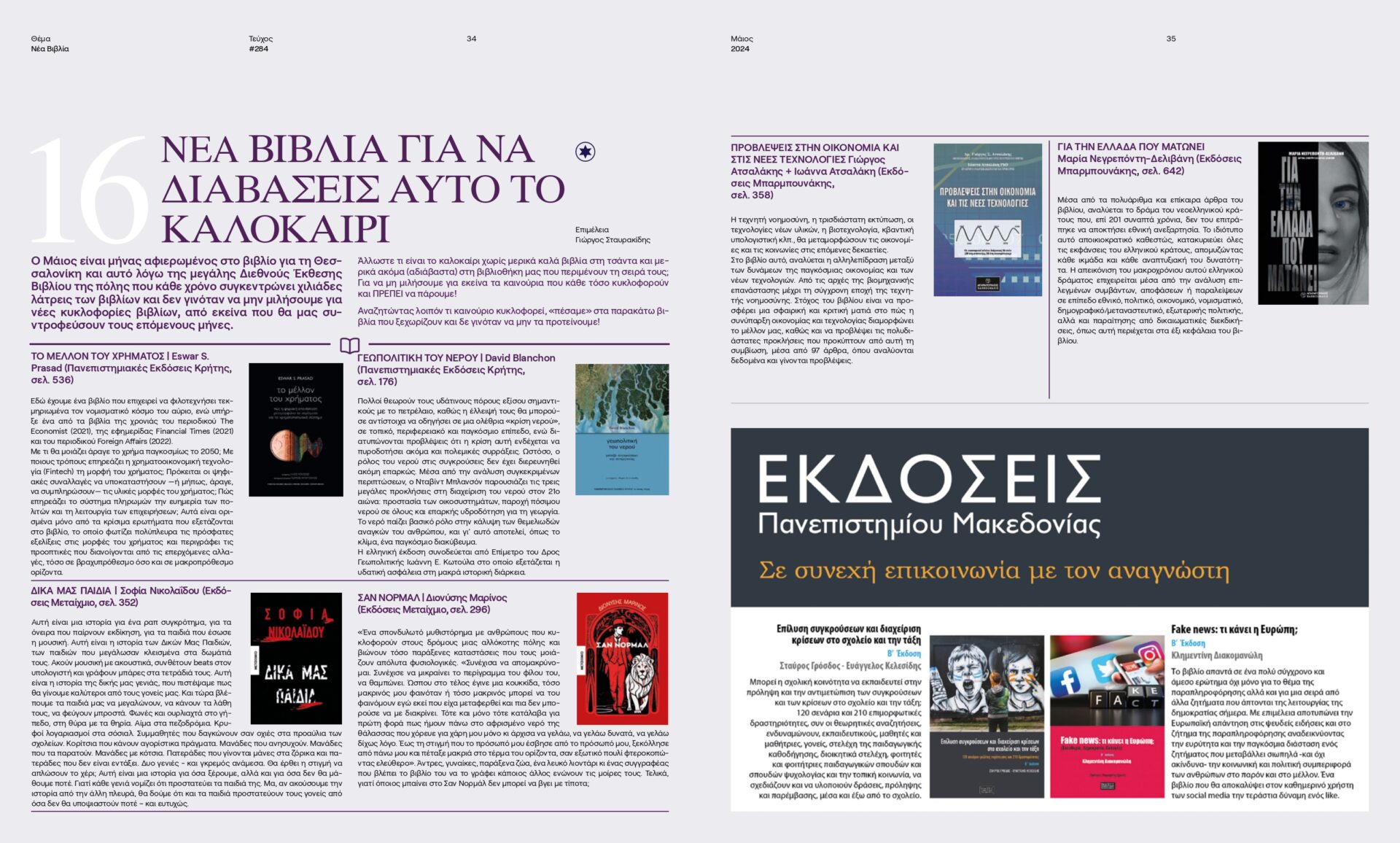 Επίσης, μια εκ βαθέων κουβέντα με τον Θανάση Παπακωνσταντίνου, μια περιδιάβαση στη ΒΙΠΕ Σίνδου, 16 βιβλία για το καλοκαίρι, αλλά και τι αρέσει και τι όχι από την πόλη στους τουρίστες που την επισκέπτονται.