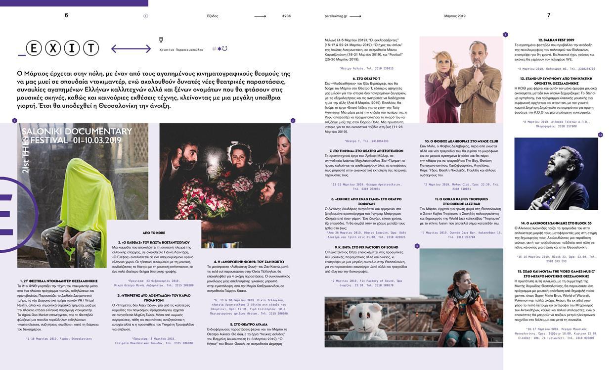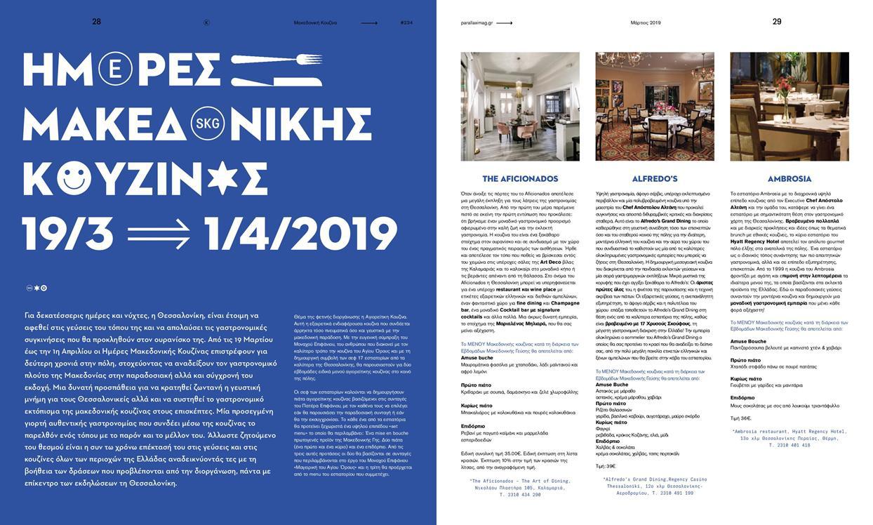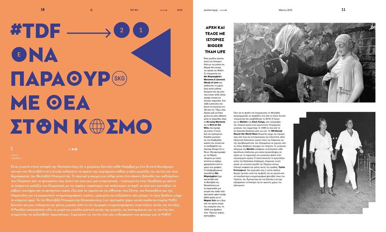 Η Parallaxi Μαρτίου 2019 είναι εδώ και υποδέχεται την άνοιξη με τα must δρώμενα αυτού του μήνα στην πόλη, σας οδηγεί στα μυστικά του 21ου Φεστιβάλ Ντοκιμαντέρ Θεσσαλονίκης, κάνει ένα μοναδικό γευστικό αφιέρωμα στις Ημέρες Μακεδονικής Κουζίνας, και σας συστήνει μια θρυλική μορφή της Τούμπας.