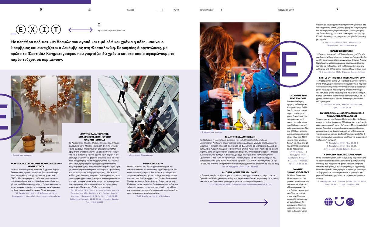 Το τεύχος Νοεμβρίου της Parallaxi κυκλοφορεί και αφιερώνεται στο επετειακό 60ο Φεστιβάλ Κινηματογράφου Θεσσαλονίκης, με έναν πλήρη οδηγό στο πρόγραμμα, τα αφιερώματα και τις πλούσιες δράσεις του διεθνή κινηματογραφικού θεσμού της πόλης. Επιπλέον, με αφορμή τον επετειακό χαρακτήρα του φετινού φεστιβάλ, σας παρουσιάζει ένα πολύχρωμο παζλ από τις πολλές και διάσπαρτες στιγμές αυτής της μοναδικής γιορτής τις τελευταίες έξι δεκαετίες. Φυσικά, σας περιμένει κι ένας οδηγός στα πιο δυνατά events στην πόλη, όπως και όσα ξεχωρίσαμε από τον κορυφαίο θεσμό της 7ης Μπιενάλε Σύγχρονης Τέχνης Θεσσαλονίκης. Καλή ανάγνωση!