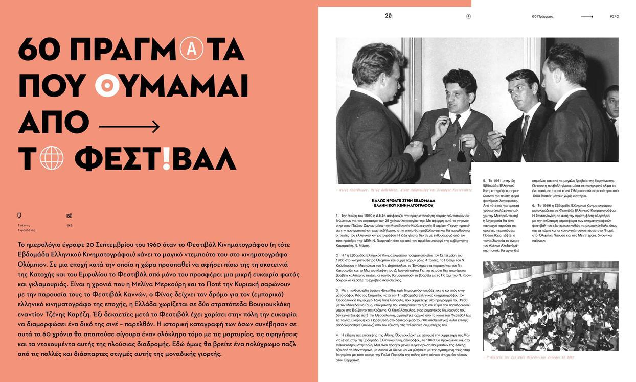 Το ημερολόγιο έγραφε 20 Σεπτεμβρίου του 1960 όταν το Φεστιβάλ Κινηματογράφου κάνει το μαγικό ντεμπούτο του στο κινηματογράφο Ολύμπιον. Έξι δεκαετίες μετά, το Φεστιβάλ έχει χαρίσει στην πόλη την ευκαιρία να διαμορφώσει ένα δικό της σινέ – παρελθόν. Η ιστορική καταγραφή των όσων συνέβησαν σε αυτά τα 60 χρόνια θα απαιτούσε σίγουρα έναν ολόκληρο τόμο με τις μαρτυρίες, τις αφηγήσεις και τα ντοκουμέντα αυτής της πλούσιας διαδρομής. Εδώ όμως θα βρείτε ένα πολύχρωμο παζλ από τις πολλές και διάσπαρτες στιγμές αυτής της μοναδικής γιορτής.