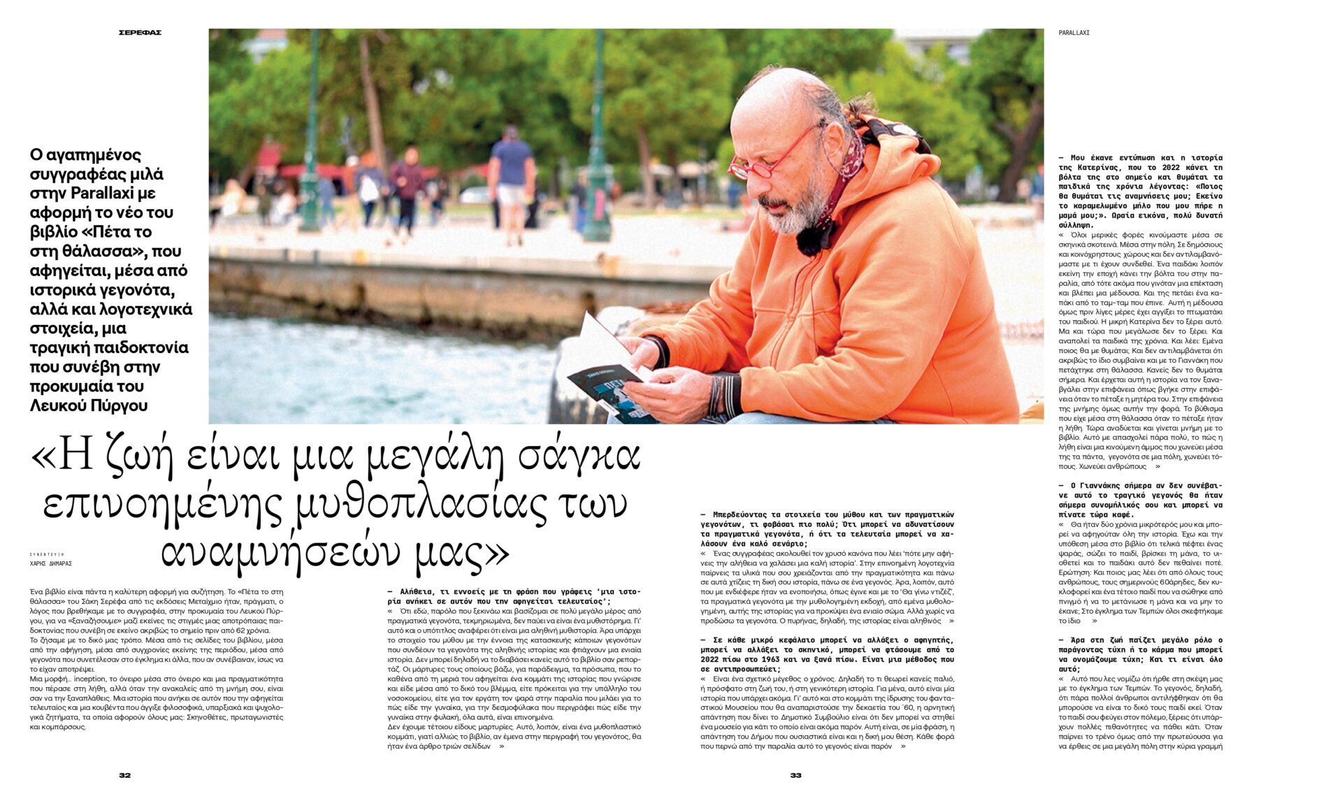 «Η ζωή είναι μια μεγάλη σάγκα επινοημένης μυθοπλασίας των αναμνήσεών μας». Ο αγαπημένος συγγραφέας, Σάκης Σερέφας μιλά στην Parallaxi με αφορμή το νέο του βιβλίο «Πέτα το στη θάλασσα», που αφηγείται, μέσα από ιστορικά γεγονότα, αλλά και λογοτεχνικά στοιχεία, μια τραγική παιδοκτονία που συνέβη στην προκυμαία του Λευκού Πύργου.