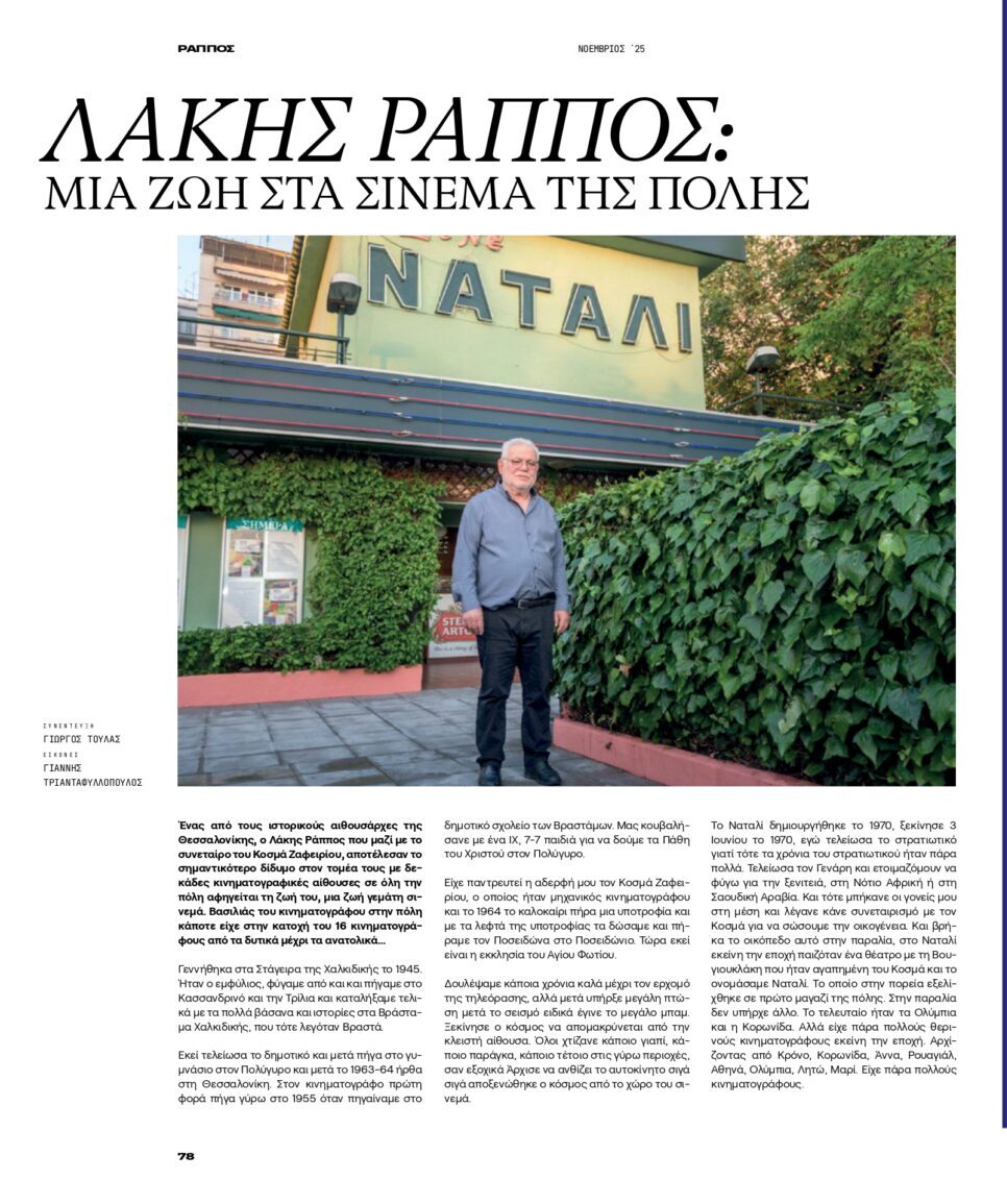 Λάκης Ράππος: Μια ζωή στα σινεμά της πόλης. Ένας από τους ιστορικούς αιθουσάρχες της Θεσσαλονίκης, ο Λάκης Ράππος που μαζί με το συνεταίρο του Κοσμά Ζαφειρίου, αποτέλεσαν το σημαντικότερο δίδυμο στον τομέα τους με δεκάδες κινηματογραφικές αίθουσες σε όλη την πόλη αφηγείται τη ζωή του, μια ζωή γεμάτη σινεμά.