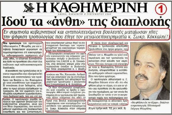 Έχουν περάσει πια πολλά χρόνια από την ηρωϊκή εποχή του Κωστάκη Καραμανλή που κέρδισε την εξουσία υποσχόμενος να τσακίσει τη διαπλοκή, τους νταβατζήδες και τα λοιπά αρπακτικά του ελληνικού δημόσιου πλούτου. Με δηλώσεις και νόμους όπως το θρυλικό Νόμο του Βασικού Μετόχου, τη σχολική περίοδο 2004-2005, που έλεγε πάνω κάτω τα εξής: « Το ιδιοκτησιακό καθεστώς, η οικονομική κατάσταση και τα μέσα χρηματοδότησης των μέσων ενημέρωσης πρέπει να γίνονται γνωστά, όπως νόμος ορίζει. Νόμος προβλέπει τα μέτρα και τους περιορισμούς που είναι αναγκαίοι για την πλήρη διασφάλιση της διαφάνειας και της πολυφωνίας στην ενημέρωση. Απαγορεύεται η συγκέντρωση του ελέγχου περισσότερων μέσων ενημέρωσης της αυτής ή άλλης μορφής. Απαγορεύεται ειδικότερα η συγκέντρωση περισσότερων του ενός ηλεκτρονικών μέσων ενημέρωσης της αυτής μορφής, όπως νόμος ορίζει. Η ιδιότητα του ιδιοκτήτη, του εταίρου, του βασικού μετόχου ή του διευθυντικού στελέχους επιχείρησης μέσων ενημέρωσης είναι ασυμβίβαστη με την ιδιότητα του ιδιοκτήτη, του εταίρου, του βασικού μετόχου ή του διευθυντικού στελέχους επιχείρησης που αναλαμβάνει έναντι του Δημοσίου ή νομικού προσώπου του ευρύτερου δημόσιου τομέα την εκτέλεση έργων ή προμηθειών ή την παροχή υπηρεσιών. Η απαγόρευση του προηγούμενου εδαφίου καταλαμβάνει και κάθε είδους παρένθετα πρόσωπα, όπως συζύγους, συγγενείς, οικονομικά εξαρτημένα άτομα ή εταιρείες. Νόμος ορίζει τις ειδικότερες ρυθμίσεις, τις κυρώσεις που μπορεί να φθάνουν μέχρι την ανάκληση της άδειας ραδιοφωνικού ή τηλεοπτικού σταθμού και μέχρι την απαγόρευση σύναψης ή την ακύρωση της σχετικής σύμβασης, καθώς και τους τρόπους ελέγχου και τις εγγυήσεις αποτροπής των καταστρατηγήσεων των προηγούμενων εδαφίων.»