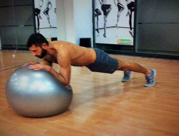 Γονατίζουμε μπροστα στη μπάλα και κατόπιν τοποθετούμε σταθερά τους αγκώνες μας επάνω στο κέντρο της. Τεντώνουμε σιγά σιγά τα πόδια μας πίσω και προσπαθούμε να είναι το σώμα μας σε μία ευθεία με φορά προς το έδαφος. Παίρνουμε βαθιές ρυθμικές αναπνοές και μένουμε στην ίδια θέση για 20-30 δευτερόλεπτα. Έτσι καταφέρνουμε να δυναμώσουμε τον πυρήνα μας, να σφίξουμε τους κοιλιακούς μας και να ενισχύσουμε τη ράχη – μέση μας.