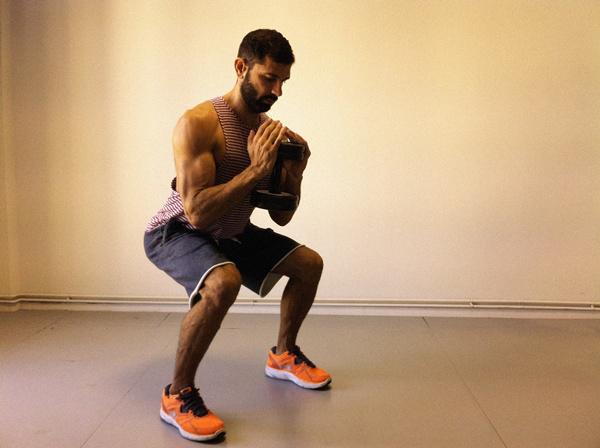 Κρατάμε σφιχτά τον αλτήρα μέσα στις παλάμες μας στο ύψος των ώμων, με ελαφρώς λυγισμένα γόνατα. Κατόπιν αργά κατεβαίνουμε βυθίζοντας τη λεκάνη μας προς τα πίσω μέχρι να σχηματίσουν τα πόδια μας ορθή γωνία. Επαναλαμβάνουμε την ίδια κίνηση για 12 με 15 φορές συνεχόμενα, προτεινόμενα σετ 4.
