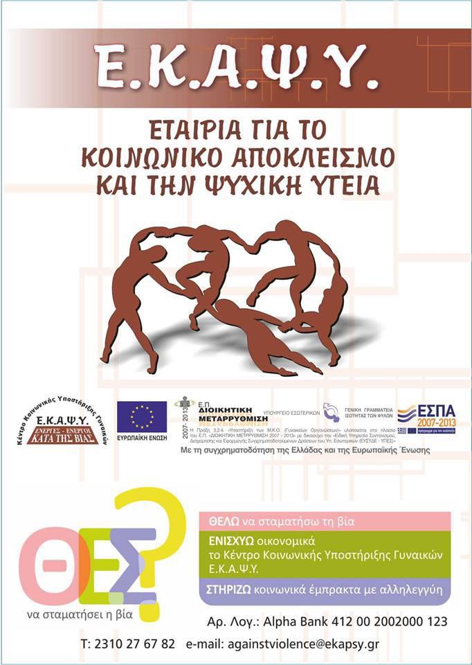 Θέλοντας λοιπόν να ευαισθητοποιήσουν τους Θεσσαλονικείς για το ζήτημα, τα μέλη του Ε.Κ.Α.Ψ.Υ. θα σας περιμένουν σήμερα, Τρίτη 25 Νοεμβρίου, από τις 11.00 μέχρι τις 20.00 στην Πλατεία Αριστοτέλους, επί της Ερμού, στο περίπτερο ενημέρωσης των πολιτών του κέντρου, έτοιμα να απαντήσουν κάθε σας ερώτηση αλλά και να σας κατατοπίσουν για τρόπους που μπορείτε να συμβάλλετε κι εσείς στο έργο του. Στα πλαίσια της ημέρας, για να δώσει έμφαση στο ζήτημα με παραστατικό τρόπο, το Ε.Κ.Α.Ψ.Υ. οργανώνει επίσης στο ίδιο σημείο στις 13.00 και 18.00 το θεατρικό δρώμενο “…αποσιωπώντας”, για τις γυναίκες που μιλούν, αναζητώντας προστασία και ασφάλεια από τον κίνδυνο της βίας. Το κείμενο του δρώμενου είναι βασισμένο σε πραγματικά γεγονότα, σε συνεργασία με γυναίκες που έχουν εμπιστευθεί και υποστηριχθεί από το Κέντρο Κοινωνικής Υποστήριξης Γυναικών – Ε.Κ.Α.Ψ.Υ.. Θέλετε λοιπόν να σταματήσει η βία; Ευαισθητοποιηθείτε.