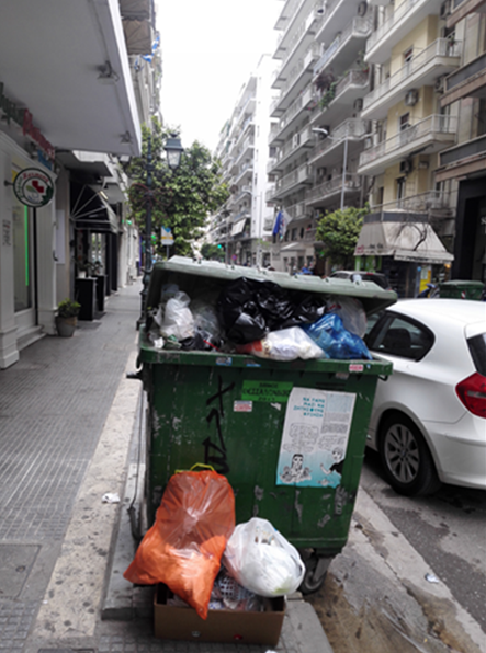 Φτάνει στο ξενοδοχείο, επιτέλους. Ο εξυπηρετικός οδηγός ταξί βοηθάει με τις βαλίτσες τις οποίες ακουμπάει δίπλα σ’ ένα κάδο σκουπιδιών, μπροστά από το κατά τα άλλα, υπέροχο ξενοδοχείο. Ο κάδος που πάσχει από… υπερχείλιση απορριμμάτων κουβαλάει και άλλες ασθένειες: Χαλασμένο πεντάλ (ή γυρισμένο προς το κράσπεδο και άρα αδύνατο να πατηθεί) και μια όμορφη ευωδία που σε συνδυασμό με την καλοκαιρινή ζέστη δημιουργεί ένα τοξικό «ανθρωποκτόνο». Απαραίτητα αξεσουάρ δίπλα στον κάδο μια λεκάνη τουαλέτας, σπασμένες καρέκλες, ξύλα, γλάστρες και ό,τι άλλο περισσεύει στην πόλη, αλλά περισσεύει και κατά την αποκομιδή των σκουπιδιών.