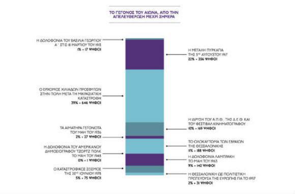 Στο ερώτημα για το σημαντικότερο γεγονός του αιώνα, η επιλογή του ερχομού των προσφύγων στην πόλη μετά τη Μικρασιατική Καταστροφή του ΄22, ως το πλέον σημαντικό γεγονός της περιόδου 1912-2012, μπορεί να θεωρηθεί απόλυτα δικαιολογημένη αφού ο ερχομός των προσφύγων δημιούργησε νέα δεδομένα και προοπτικές στη Θεσσαλονίκη και επηρέασε σημαντικά την εικόνα και το μέλλον της. Η μεγάλη πυρκαγιά του 1917, που υπήρξε μεν καταστροφική αλλά αποτέλεσε την αιτία μιας νέας πορείας για την πόλη, όντως είναι ένα σημαντικό γεγονός στην ιστορία της Θεσσαλονίκης και δικαιολογείται η επιλογή της ως δεύτερο σημαντικό γεγονός. Όμως φαίνεται πως υποβαθμίστηκε, ίσως από άγνοια των ιστορικών δεδομένων της εποχής του Εμφυλίου (άλλωστε ελάχιστοι τα γνωρίζουν αυτά …), το γεγονός της δολοφονίας του Αμερικανού δημοσιογράφου Τζορτζ Πολκ στη Θεσσαλονίκη στα ταραγμένα χρόνια του Εμφυλίου, που ήλθε τελευταίο ως γεγονός με… μία μόνο ψήφο.