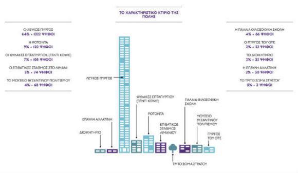 Ένα αμφίσημο ερώτημα: Τι σημαίνει χαρακτηριστικό κτίριο της πόλης; Αυτό που την συμβολίζει; που είναι ο λογότυπος, το σήμα της, διότι είναι τόσο ξεχωριστό; Ή μήπως αυτό που συμβάλλει στη διαμόρφωση του ξεχωριστού χαρακτήρα και της ιδιαίτερης αρχιτεκτονικής της φυσιογνωμίας; Οι ερωτώμενοι υπέδειξαν κατά 64% τον Λευκό Πϋργο…. μάλλον απαντώντας στην πρώτη εκδοχή του ερωτήματος. Επιλογή απολύτως προβλέψιμη αλλά και συγχρόνως παράδοξη, που υπογραμμίζεται από την εντυπωσιακή διαφορά ως προς το επόμενο κτίσμα (Ροτόντα 9%). Πώς ένα απέριττο, σχεδόν παιδικό σε μορφή κτίριο, που οφείλεται στους οθωμανούς κυρίους της Θεσσαλονίκης, έχει αναγορευθεί σε αδιαμφισβήτητο σύμβολό της; Σκέπτομαι μήπως η απάντηση πρέπει να αναζητηθεί στην πολύμορφη κληρονομιά/παράδοση μιας πόλης που υπήρξε ελληνιστική, ρωμαϊκή, βυζαντινή, οθωμανική, εβραϊκή, προσφυγική και νεοελληνική. Ο Λευκός Πύργος με την αυστηρή μοναδικότητά του, την ιδεοτυπική μορφή του, αλλά και την λειτουργία του ως Μουσείου της πόλης, αναλαμβάνει πειστικά τον ρόλο αυτό. Πράγματι, πολύ δύσκολα ένα άλλο μεμονωμένο κτίριο θα μπορούσε να ενσωματώσει και να εκφράσει ικανοποιητικά αυτήν την πολυδιάστατη πραγματικότητα. Απ΄την μεριά μου, κλίνοντας προς την δεύτερη εκδοχή του ερωτήματος, θα σκεφτόμουν μεγαλύτερες ενότητες που οπωσδήποτε εμπεριέχουν και διαχρονικά στοιχεία όπως, τα τείχη, το προσπελάσιμο τμήμα του λιμανιού, την παλιά και νέα παραλία, τον μνημειακό άξονα της Αριστοτέλους και της αρχαίας αγοράς, την πανεπιστημιούπολη, τον άξονα των μουσείων και της πανεπιστημιακής βιβλιοθήκης. Και ταυτόχρονα αναρωτιέμαι: αν το ερώτημα αφορούσε χαρακτηριστικά κτίρια της τελευταίας 20ετίας ή από το 2000 και μετά, τι θα επέλεγε ο κόσμος της πόλης; Μήπως κάποιο από τα μεγάλα εμπορικά Μολ στον περιαστικό χώρο της Θεσσαλονίκης;