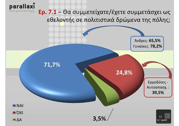 Με μια σειρά διεξοδικές συνεντεύξεις βασισμένες σε ένα αντιπροσωπευτικά επιλεγμένο δείγμα πολιτών, διερευνήθηκε ο βαθμός διείσδυσης και επιρροής του φεστιβαλικού θεσμού στο πολιτιστικό γίγνεσθαι της πόλης, το κατά πόσο αποκρυσταλλωμένη και ξεκάθαρη είναι η εικόνα του, καθώς και οι βασικές πολιτιστικές ανάγκες της πόλης και οι αντιλήψεις του κοινού για ζητήματα πολιτισμού στον καιρό της κρίσης.