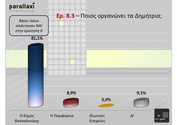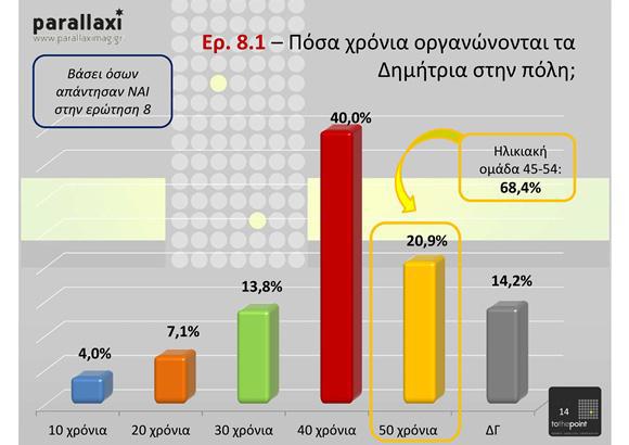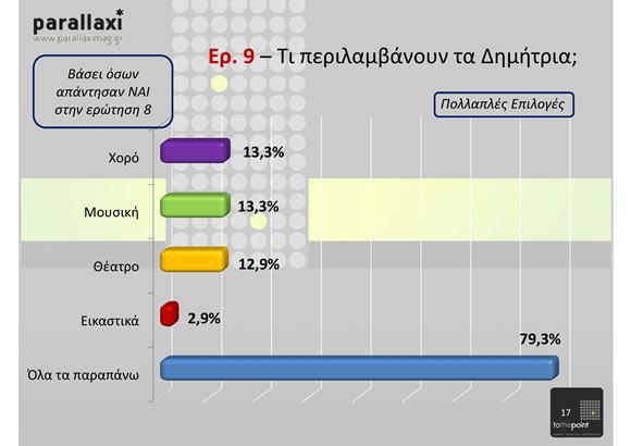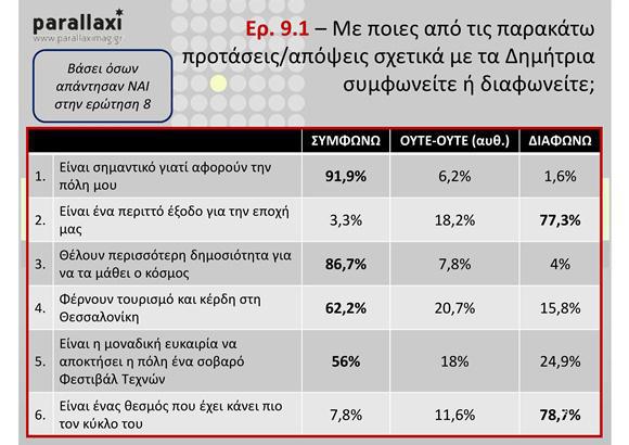 Η έρευνα πραγματοποιήθηκε από ειδικούς ερευνητές της parallaxi σε δείγμα 500 ανθρώπων διαφόρων ηλικιών και τα στοιχεία της θα τα επεξεργαστεί η εταιρία ερευνών To the Point. Παρουσιάστηκε στο κοινό κατά τη διάρκεια της ημερίδας για τα Δημήτρια ως αστικό καλλιτεχνικό φεστιβάλ, χθες το μεσημερι στην αίθουσας Αιμίλιος Ριάλδης της ΔΕΘ.
