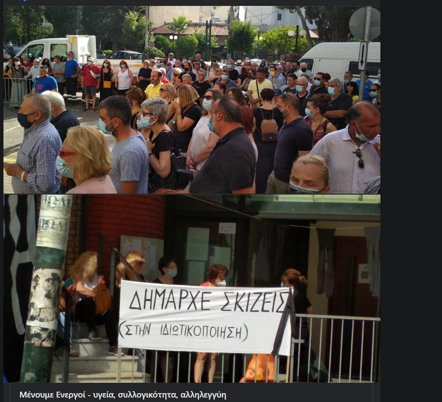 Εικόνα 1: Δεκάδες πολίτες διαμαρτύρονται σχετικά με την απόφαση της Διοίκησης του Δήμου Νέας Φιλαδέλφειας-Νέας Χαλκηδόνας για το έργο της αντικατάστασης λαμπτήρων έπειτα από κάλεσμα του Σωματείου εργαζομένων.