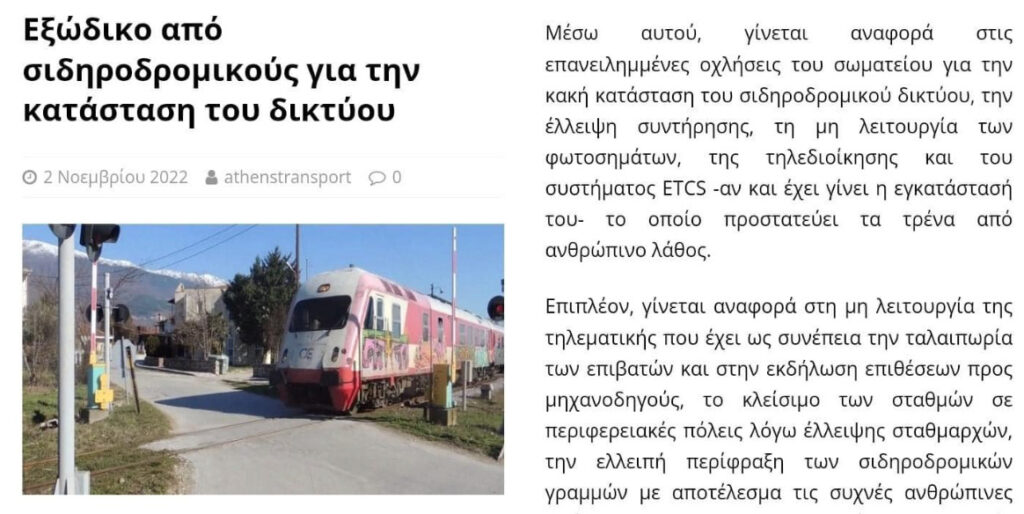 Ο πρόεδρος της Πανελλήνιας Ομοσπονδίας Σιδηροδρομικών Γιάννης Ντίτσας, μιλώντας στο Open, έκανε γνωστό πως τα δύο τρένα κινούνταν στην ίδια γραμμή για περίπου 10 λεπτά πριν συγκρουστούν μετωπικά. Σύμφωνα με τον ίδιο δεν υπάρχει κάτι αντίστοιχο με GPS προκειμένου να γίνεται εμφανές πως τα δύο τρένα κινούνται το ένα πάνω στο άλλο.