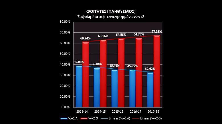 3. Προχωρώντας στη γραμμική αποτύπωση της έμφυλης ανάπτυξης των εγγεγραμμένων κατ’ έτος σπουδών και διάρκεια φοίτησης σε εύρος πενταετίας (2013-14 έως 2017-18), διέκρινα καταρχάς μια σταδιακή μείωση της παρουσίας φοιτηττου αρσενικού φύλου στις κατηγορίες της εξαετούς και υπερεξαετούς φοίτησης (ν+2 και >ν+2).