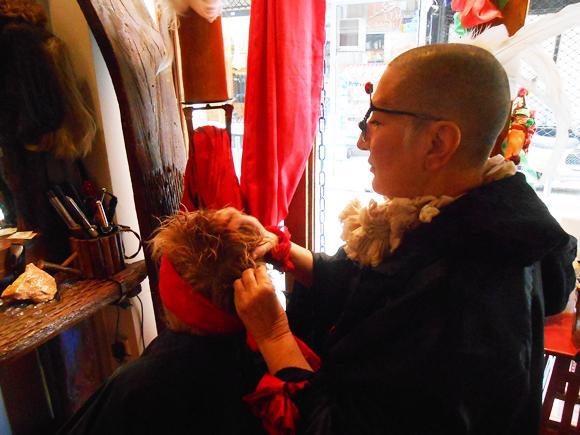 Μια κούκλα δεσπόζει 25 χρόνια, από τότε που είχε ανοίξει το THRIX. «Αυτή η κούκλα έχει φωτογραφηθεί τόσο πολύ από τουρίστες και περαστικούς, όσο και ο Λευκός Πύργος» μου αναφέρει γελώντας, αφού τόσα χρόνια και πριν μετακομίσει το THRIX σε νέο χώρο, την είχε τοποθετημένη έξω από το μαγαζί. Αν και δεν της έχει βρει όνομα εδώ και δυόμιση δεκαετίες, πάντοτε ασχολείται μ’ αυτήν, την περιποιείται, ενώ πολλές φορές της έκλεινε τα μάτια, όταν θεωρούσε πως γίνονταν πράγματα που «δεν έπρεπε ν’ αντικρίσει», ενώ εξηγεί πως όταν μια φορά πήγε να την ντύσει νύφη, τρόμαξε από το θέαμα και την ιδέα και τελικά την άφησε ξανά γυμνή. «Δε μου αρέσει ως ιδέα ο γάμος. Μου αρέσει να δένονται οι άνθρωποι, να συμβιώνουν, ν’ αγαπιούνται και να ερωτεύονται, ο γάμος όμως μ’ ενοχλεί ως ιδέα και ως διαδικασία• μας κάνει να φαινόμαστε καρικατούρες» μου λέει χαρακτηριστικά. Η κούκλα είναι αυτή που δέχεται τις παρεμβάσεις της σχετικά με ο,τι τη στενοχωρεί στον κόσμο. Αυτό γινόταν πάντοτε, «ο,τι μ’ ενοχλεί στην κοινωνία, το αποτυπώνω στην κούκλα» μου εξηγεί, ενώ προσθέτει πως «το σπασμένο χέρι που έχω βάλει δίπλα από το πόδι της, δείχνει πως έχω στο μυαλό μου την πληγωμένη κοινωνία του σήμερα». Αν και δε δένεται με αντικείμενα, η κούκλα είναι μέρος της ζωής της και του κομμωτηρίου του THRIX, είναι αναπόσπαστο κομμάτι του.