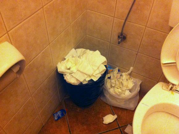 Οι τουαλέτες του προσωπικού εδώ και καιρό δεν έχουν χαρτί υγείας και είναι περισσότερο από σαφές τι πάμε να κάνουμε όλοι όταν βρισκόμαστε στους διαδρόμους με ένα ρολό στο χέρι! Δεν υπάρχει ούτε σαπούνι και οι καλονοικοκυρές εφοδιάζουμε με υγρό σαπούνι, εγώ πήγα ένα πήλινο σκεύος στο οποίο συχνά-πυκνά βάζω τα σαπουνάκια των ξενοδοχείων και άλλες (ή άλλοι ίσως) πιο γενναιόδωροι βάζουν κανονικές μπάρες σαπουνιού. Αυτά τα συνηθίσαμε. Εντάξει. Και έλεγα, δεν πειράζει, φροντίζεις την υγιεινή στο χώρο σου…