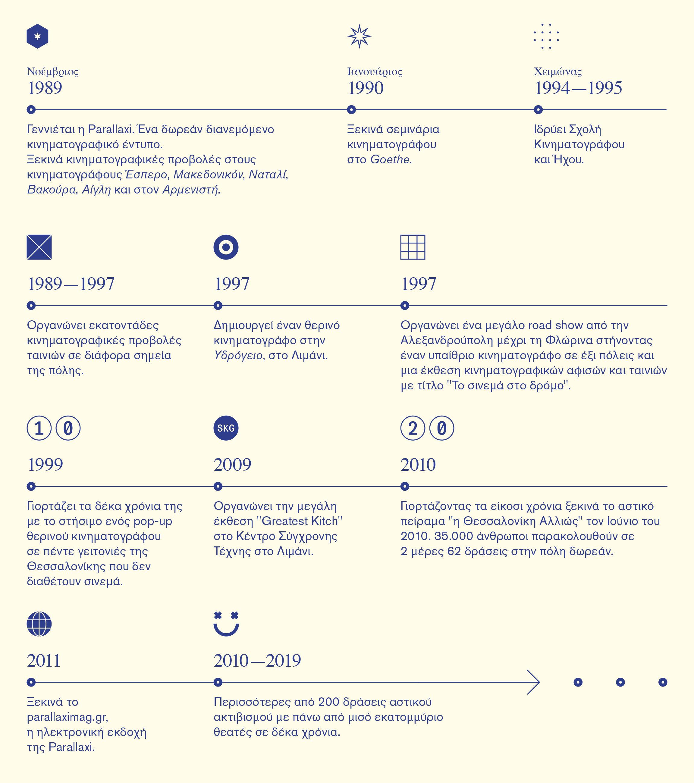 Νοέμβριος 1989 | Γεννιέται η Parallaxi. Ένα δωρεάν διανεμόμενο κινηματογραφικό έντυπο. Ξεκινά κινηματογραφικές προβολές στους κινηματογράφους Έσπερο, Μακεδονικόν, Ναταλί, Βακούρα, Αίγλη και στον Αρμενιστή.