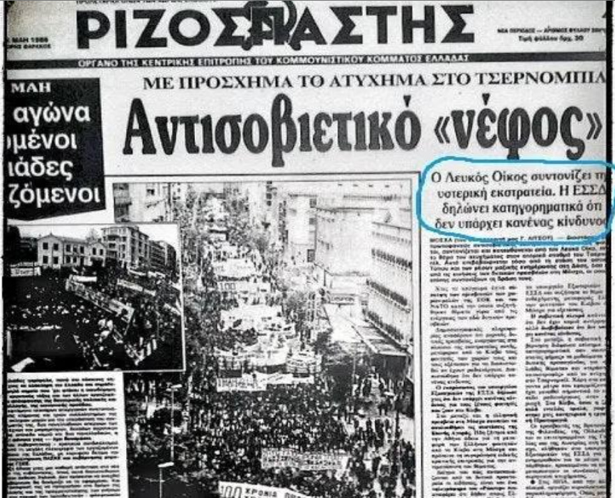 Σε αυτό βοηθούσαν και φιλοσοβιετικά μέσα αναπαράγοντας την ψευδή άρνηση της ΕΣΣΔ σχετικά με το ατύχημα, εμμένοντας στην θέση τους για προπαγάνδα της Δύσης κατά της Σοβιετικής Ένωσης. Κύριο παράδειγμα αποτελεί ο «Ριζοσπάστης» με το πρωτοσέλιδο «Αντισοβιετικό ‘νέφος’». Η στάση της εφημερίδας προς το γεγονός συμπυκνώνεται στην φράση που ποτέ δεν ειπώθηκε αλλά υπονοήθηκε: φάτε μαρούλια άφοβα.