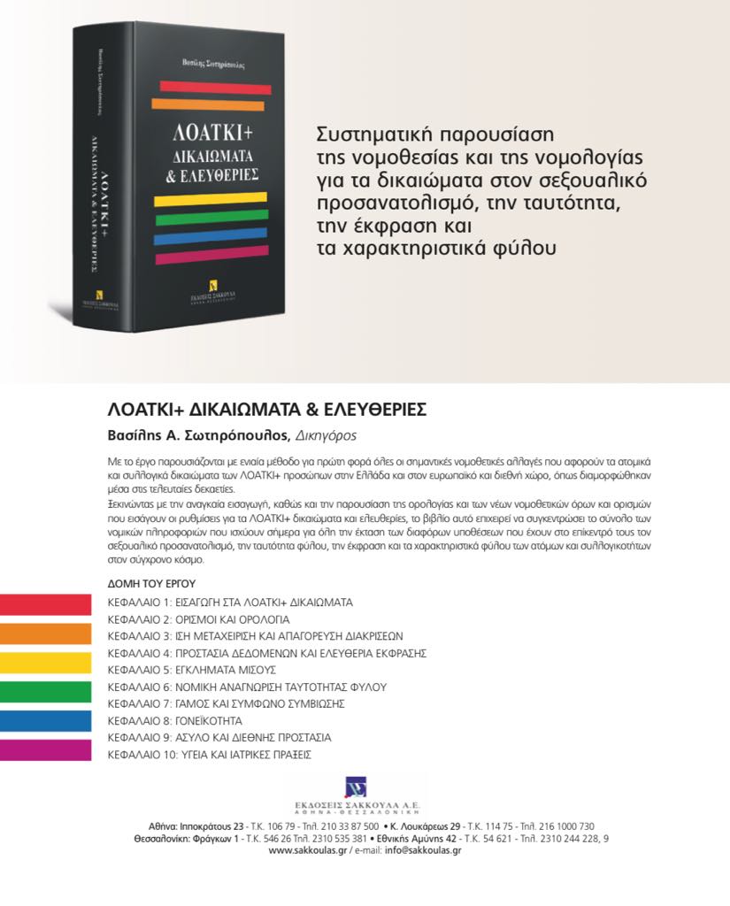 Κυκλοφόρησε από τις εκδόσεις ΣΑΚΚΟΥΛΑ το έργο ζωής ενός από τους πιο μάχιμους δικηγόρους των ΛΟΑΤΚΙ δικαιωμάτων, του Βασίλη Σωτηρόπουλου. Και αν εκ πρώτης όψεως οι 1146 σελίδες μπορεί να τρομάξουν τον αναγνώστη, είναι χωρίς υπερβολές το πιο ενδιαφέρον σύγγραμμα που διάβασα τους τελευταίους μήνες.