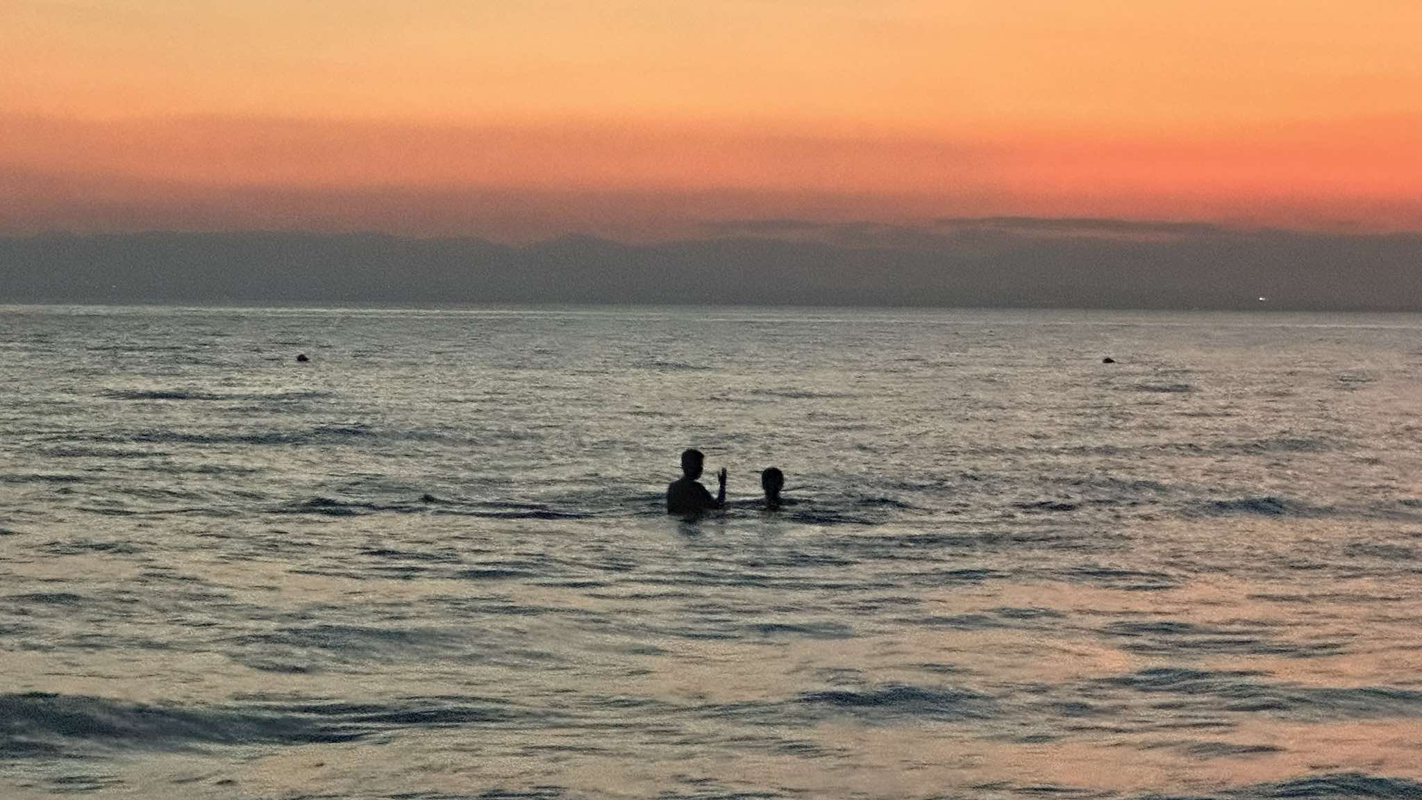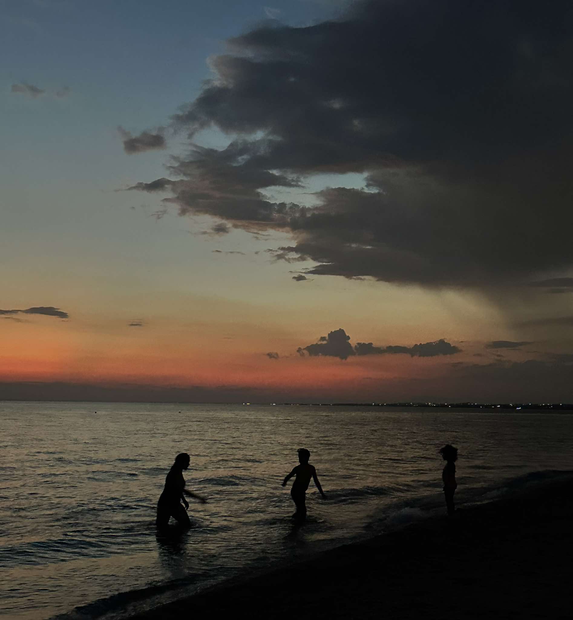 O ήλιος βουτά μαζί μας στην θάλασσα και πίσω η πλάτη μας βυθίζεται στο σκοτάδι της νύχτας, μία ρωσίδα γύρω στα 50 κατεβαίνει με τον γιο της στην θάλασσα, σκουπίζει με την πετσέτα της τον ιδρώτα που κυλά στο μέτωπο της. Την ακούμε στα κλεφτά να λέει “πολύ καθάρισμα είχαν τα ενοικιαζόμενα σήμερα” ο γιος της την πιάνει από το χέρι και βουτούν μαζί μέσα. Λίγο παραδίπλα μία παρέα 20ριδων, προσπαθούν να κάνουν σαπ – ήταν της μόδας φέτος-.