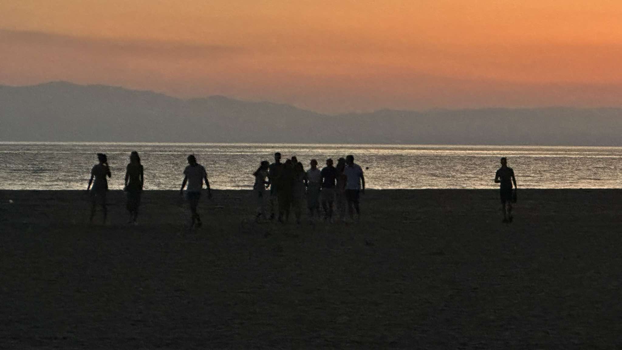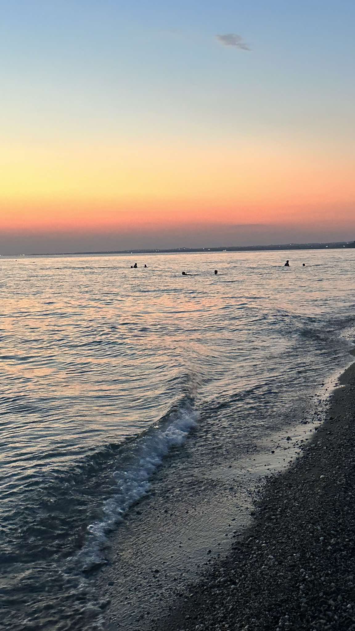 Αγόρια παραδίπλα, τραγουδούν με μία κιθάρα στο χέρι. Παιδιά κυλιούνται στην άμμο και μαζεύουν πέτρες και κοχύλια στα κουβαδάκια τους. Απλώνουμε τις πετσέτες μας και τρέχουμε στην θάλασσα. Η οποία έχει πάρει τα χρώματα, τ’ουρανού. Ακόμη είναι απόγευμα, δεν έχει βραδιάσει.