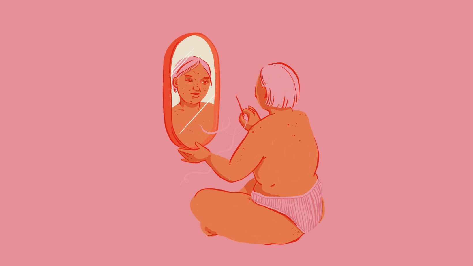 Ωστόσο, η δυσμορφική διαταραχή, έχει πολλές εκφάνσεις και η δικιά μου η περίπτωση δεν άφησε καμία παραπονεμένη. Οι ώρες που περνούσα στον καθρέφτη γινόταν όλο και συχνότερες και με μεγαλύτερη διάρκεια. Εκτός από το σώμα μου, άρχισα να αναλύω το δέρμα μου και τα προβλήματά του. Πόσο έντονα ήταν τα σπυράκια μου, πώς φαινόταν οι μικρές σπασμένες φλέβες στο πρόσωπό μου και στα πόδια μου – που δεν έβλεπε κανένας άλλος, παρά μόνο εγώ – και να τα έβλεπε δηλαδή ο όποιος δήποτε, δεν θα έπρεπε να με ενδιαφέρει.