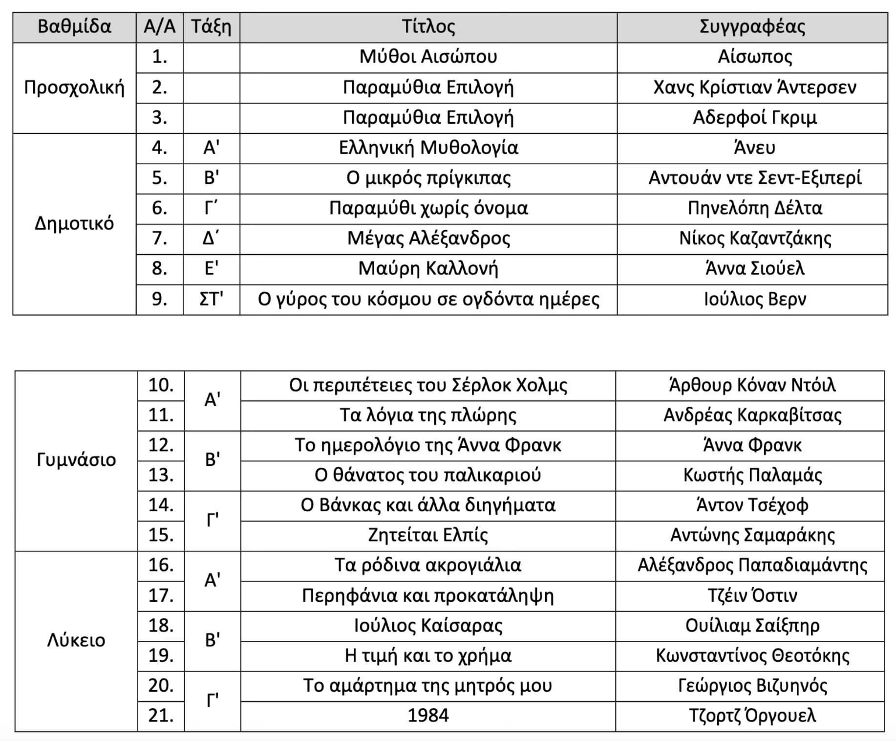 Κυκλοφόρησε σήμερα στο διαδίκτυο η παρακάτω λίστα με τους 21 τίτλους λογοτεχνικών βιβλίων που, απ’ ό,τι φαίνεται, θα διανεμηθούν από τον Φεβρουάριο της φετινής διδακτικής χρονιάς στους μαθητές και τις μαθήτριες όλων των τάξεων, από το Νηπιαγωγείο έως και την Γ’ Λυκείου.