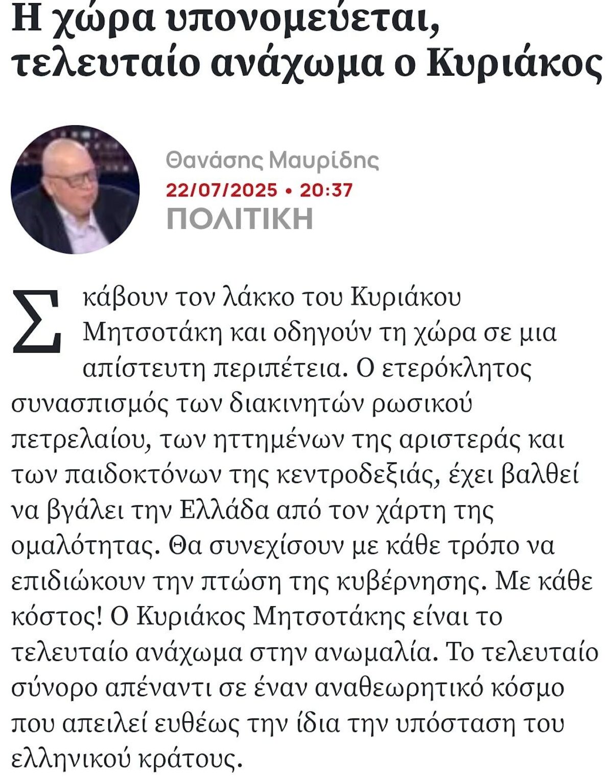 Από τη μέρα που ανέλαβε την εξουσία ο Κυριάκος Μητσοτάκης έστησε ως γνωστόν, έναν ολόκληρο μηχανισμό μέσα στο Μαξίμου, βάζοντας στο payroll μια σειρά γνωστών δημοσιογράφων, εγκαθιστώντας τους δίπλα του, προσλαμβάνοντας δεκάδες άλλους σε γραφεία τύπου, υπηρεσίες, φιλικούς δήμους, οργανισμούς, ενώ ταυτόχρονα έστησε ένα παραμάγαζο όπως την Ομάδα Αλήθειας, το οποίο πληρώνοντας το με τις γνωστές μεθόδους φρόντισε να το οπλίσει με δυνατότητα να πυροβολεί στα social εναντίον αντιπάλων.