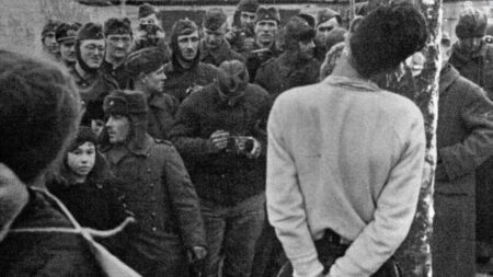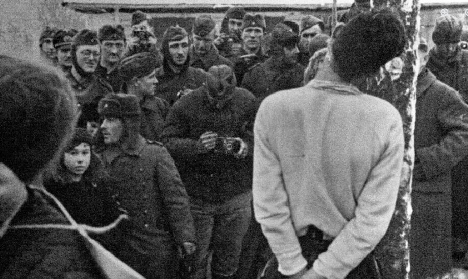 Δίπλα στο κείμενο εκτίθεται μια από τις πιο τρομακτικές εικόνες του πολέμου: στρατιώτες της Βέρμαχτ και των Ες-Ες παρακολουθούν και φωτογραφίζουν την εκτέλεση παρτιζάνων στη Σοβιετική Ένωση (1941–1942). Μετρά κανείς τουλάχιστον πέντε φωτογραφικές μηχανές στραμμένες προς το σώμα που εκτελείται. Η εκτέλεση είναι θέαμα. Και η βία τεκμηριώνεται και πολλαπλασιάζεται μέσα από την πράξη της φωτογράφησης. Φωτογραφίες-τρόπαια. Σε πόσα λευκώματα να κατέληξαν άραγε; Σε πόσα συρτάρια, σε πόσες οικογενειακές αφηγήσεις;