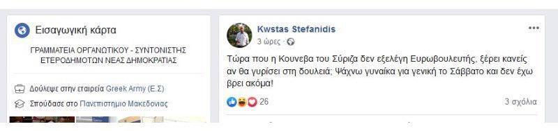 Άνθρωποι σαν τον Κώστα Στεφανίδη υπάρχουν δυστυχώς χιλιάδες και με κάθε ευκαιρία εκδηλώνονται. Το ζήτημα είναι τι κάνουμε εμείς; Το ζήτημα είναι πως ξεβρακώνεις αυτόν και όσους έκαναν λάικ, έβαλαν καρδούλες και γελάκια, σχολίασαν επικροτώντας πριν κατέβει το ποστ. Και πριν ευτυχώς ο αρχηγός της Ν.Δ, προς τιμήν του τον διαγράψει με τη φράση ”Ανάλογες εκφράσεις και συμπεριφορές δεν έχουν καμία θέση στην Παράταξή μας”.