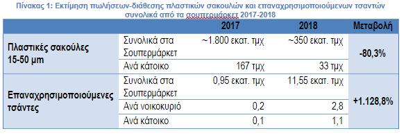 - Παράλληλα η διάθεση επαναχρησιμοποιούμενων τσαντών 11πλασιάστηκε με αύξηση κατά 1.129% φτάνοντας τα 11,5 εκατ. τεμάχια