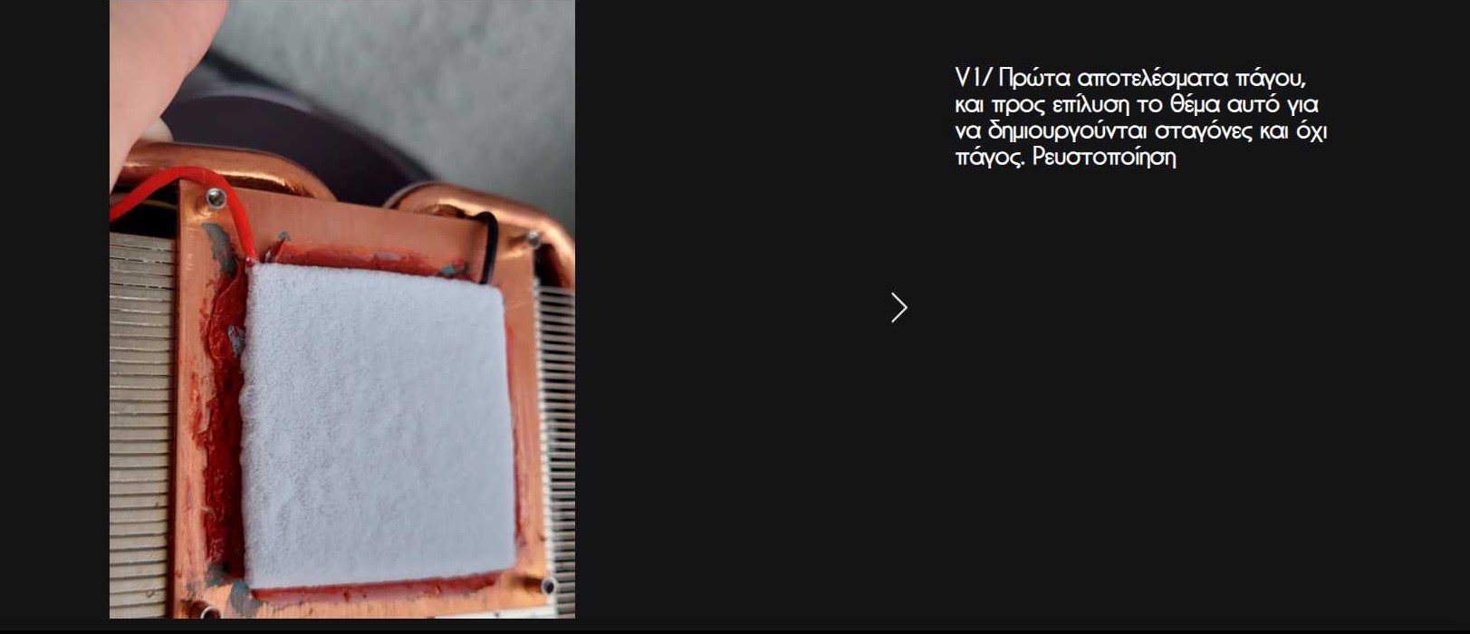 Στην συγκεκριμένη περίπτωση του AITER το σύστημα λειτουργεί με περίπου 240 WATT την ώρα. Στο σημείο ένωσης που προκαλείτε ψύξη, χρησιμοποιούμε μια επιπρόσθετη ψύκτρα και με κατευθυνόμενη ροή χλιαρού αέρα, ο πάγος που δημιουργείται μετατρέπεται σε μορφή σταγόνων. Επίσης στο σημείο ένωσης που προκαλείται θέρμανση, έχει τοποθετηθεί συσκευή με διπλούς ανεμιστήρες ώστε να μειώνεται η θερμοκρασία(περίπου 130 °C με 140 °C μετατρέπονται σε 60 °C με 85 °C) της συσκευής και να λειτουργεί μακροπρόθεσμα χωρίς να μειώνεται το προσδόκιμο ζωής.