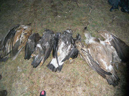 - Οι δυο Χρυσαετοί, τα δυο Όρνια και η Γερακίνα πέθαναν λίγες μέρες πριν ανακαλυφθούν από τους φύλακες της περιοχής, αφού έφαγαν από το δεύτερο άλογο. Βρέθηκαν σε ακτίνα μικρότερη των 50 μ. από το πτώμα, ενώ άλλοι δύο Χρυσαετοί βρέθηκαν σε μεγαλύτερη απόσταση και μέσα στους θάμνους, σε αποσύνθεση και φαγωμένοι από θηλαστικά. Είχαν πεθάνει πριν από 2-3 εβδομάδες, κάτι που δείχνει ότι και το πρώτο άλογο ήταν κατά πάσα πιθανότητα και αυτό δηλητηριασμένο.