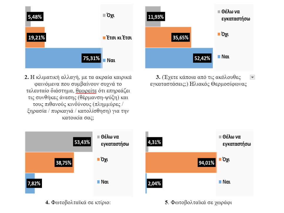 Πρόσθετες προτάσεις των ερωτηθέντων στα θέματα που αναφέρθηκαν είναι: αιτήματα για φθηνότερο πετρέλαιο, φυσικό αέριο, ηλεκτρικό ρεύμα, απλές διαδικασίες για φωτοβολταϊκά, κρατική πρόληψη για την αντιμετώπιση ακραίων φαινομένων, παραγωγή ενέργειας από ΑΠΕ και αυξημένα χρηματοδοτικά προγράμματα για «πράσινο σπίτι» («Εξοικονομώ»). Όσον αφορά το αν αισθάνονται ασφαλείς στο χώρο διαβίωσής τους, υπάρχει πάντοτε, σε κάποιο βαθμό, φόβος πυρκαγιάς, σεισμού, πλημμύρας, καταιγίδας, κατολισθήσεων, για τις οποίες το επιτόκιο αναφοράς σχετίζεται άμεσα α) με την περιοχή όπου βρίσκεται το κτίριο, β) με την ηλικία του κτιρίου και γ) με τον περιβάλλοντα χώρο.